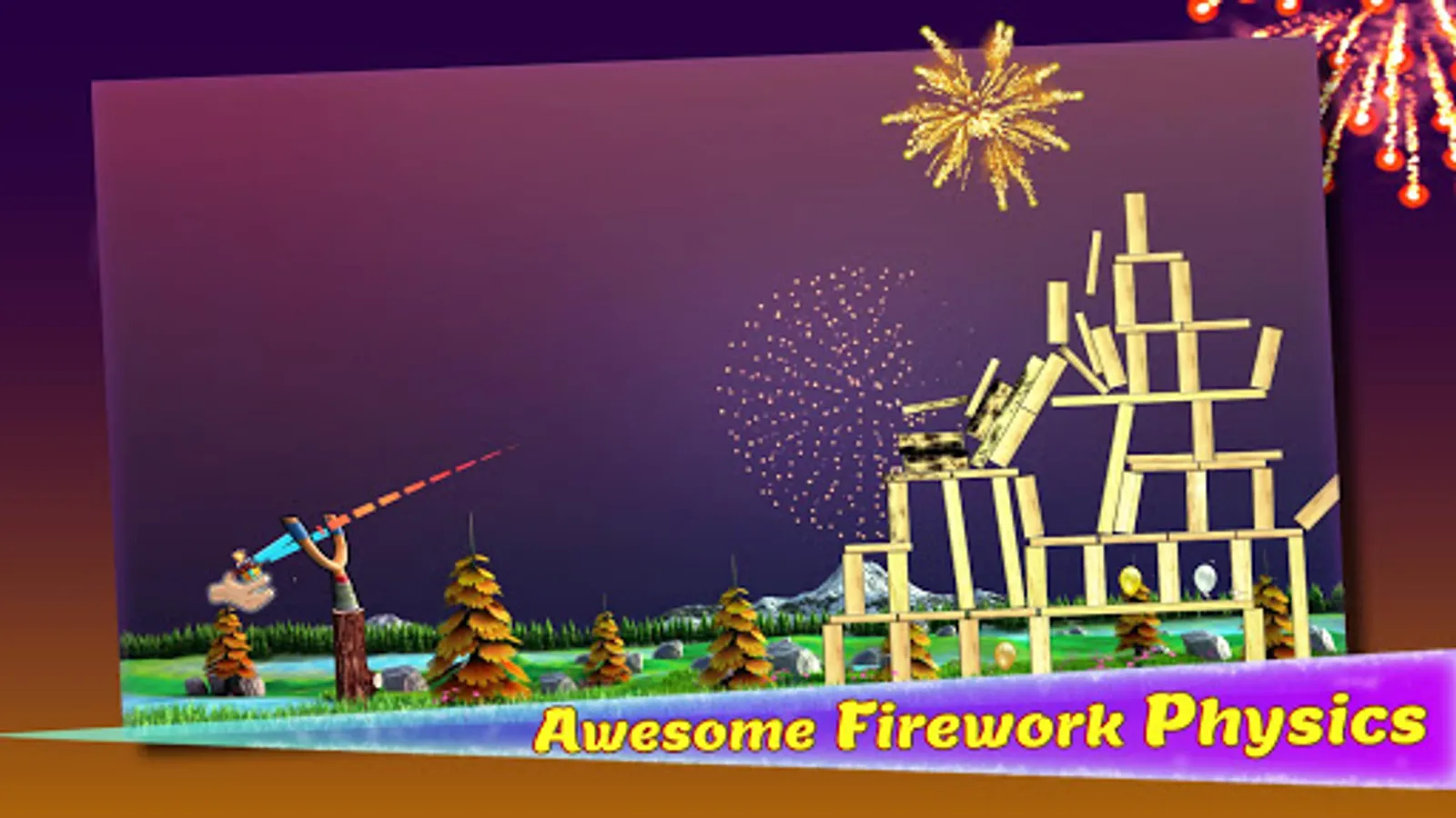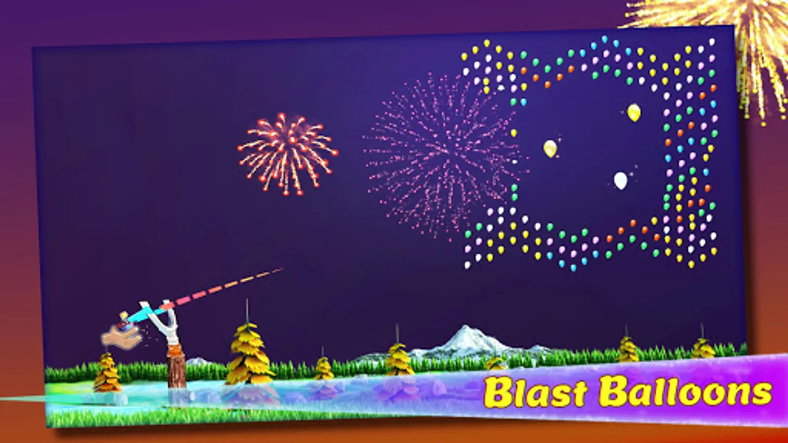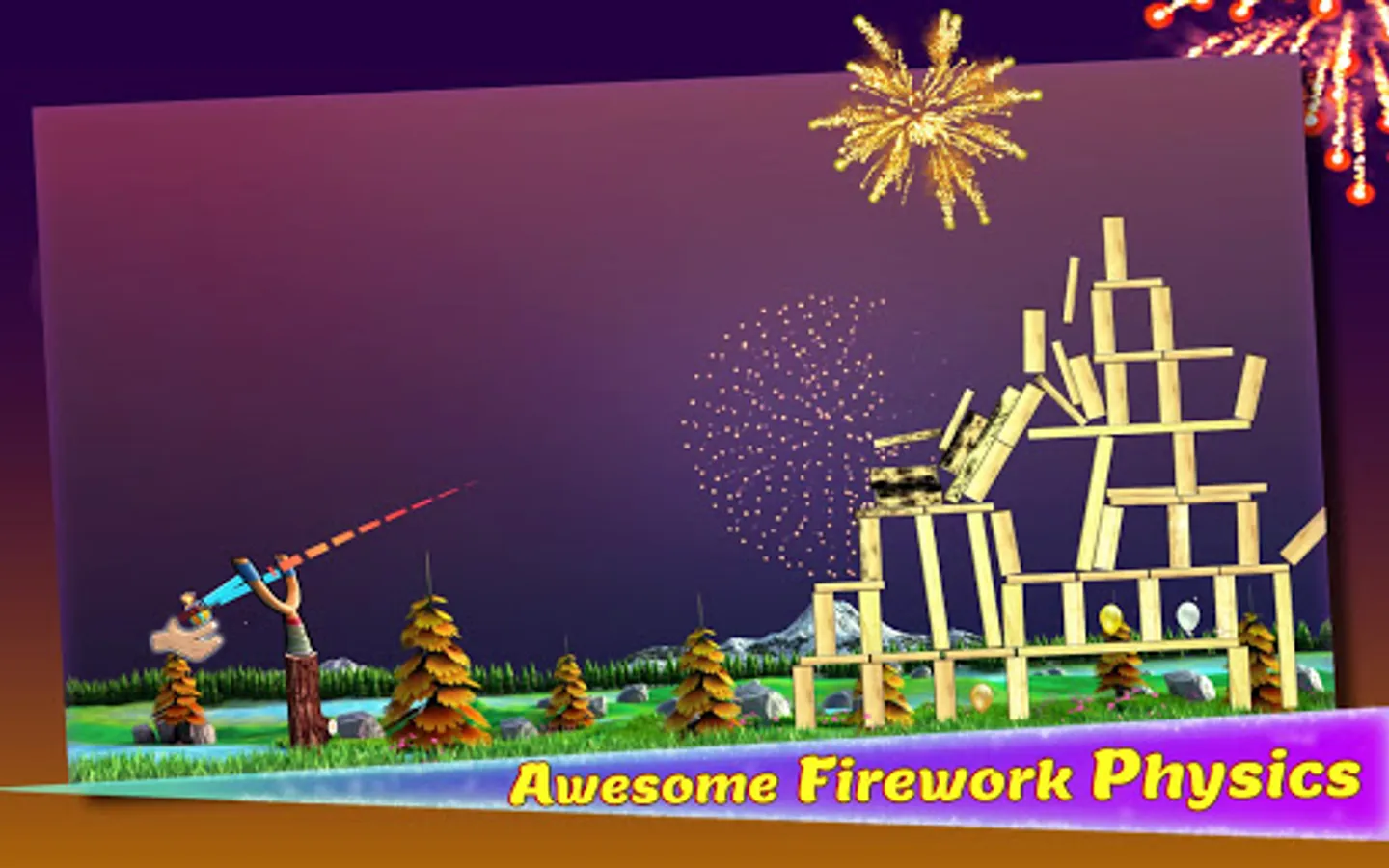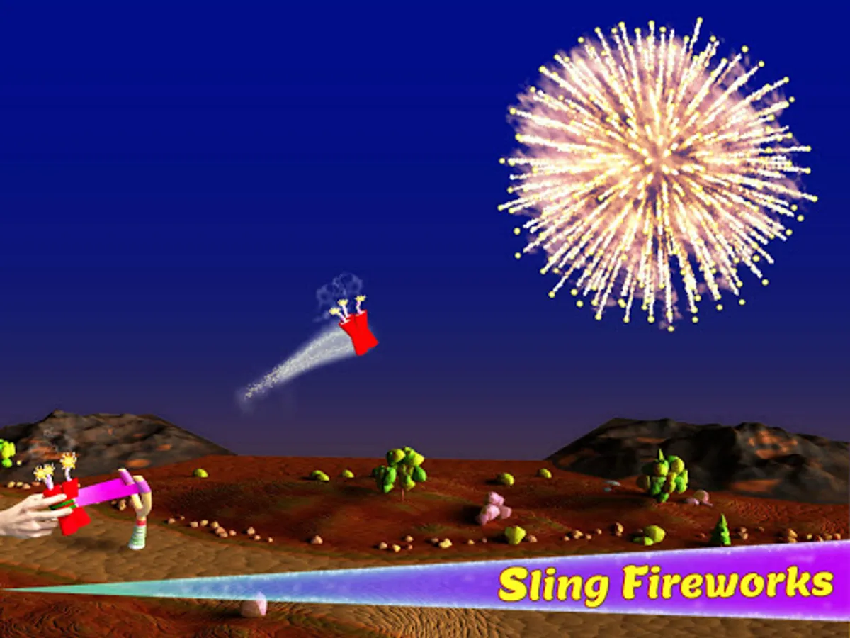 Slingshot fireworks to pop target gold, silver and bronze balloons in exciting simulated fantasy environments.