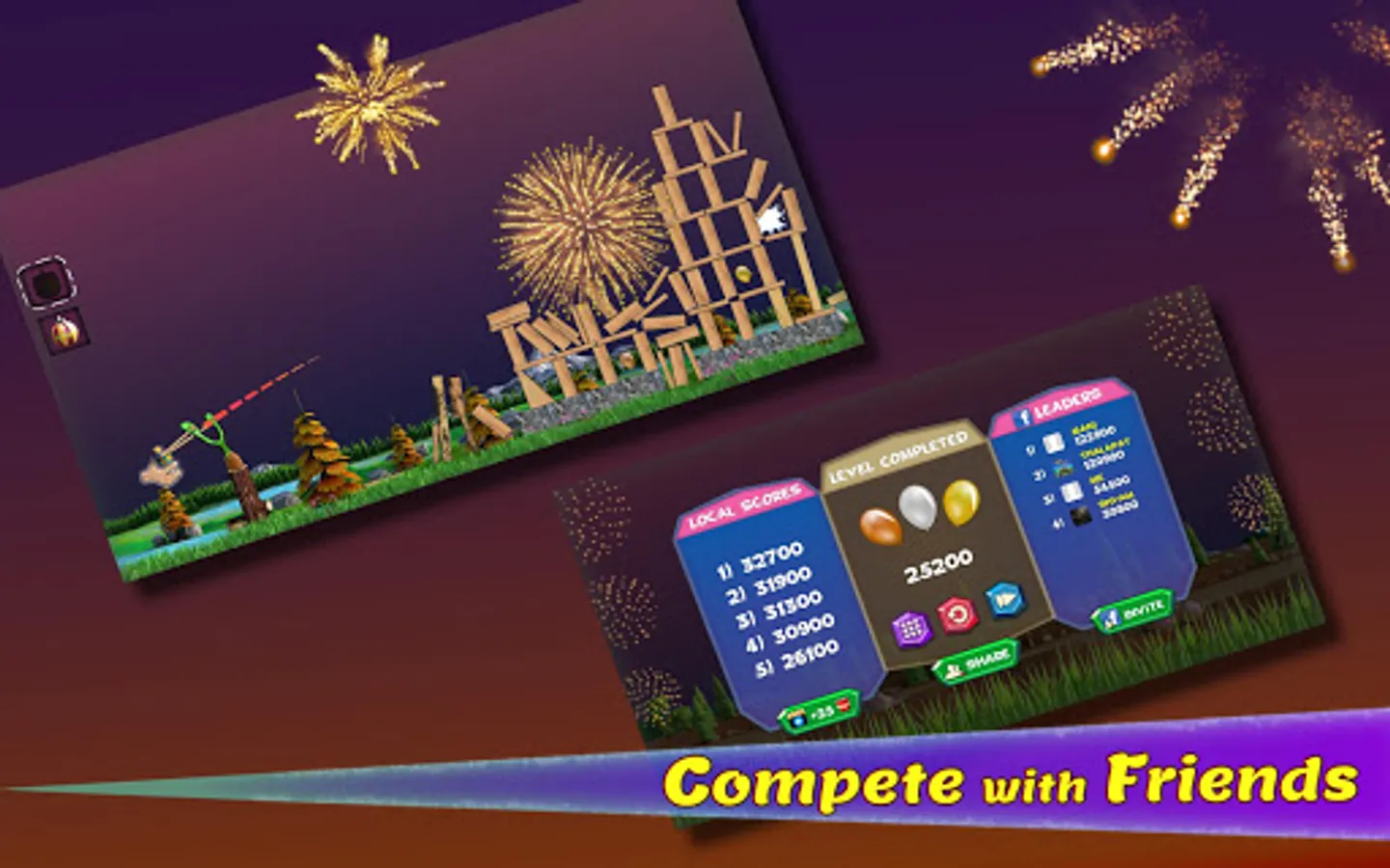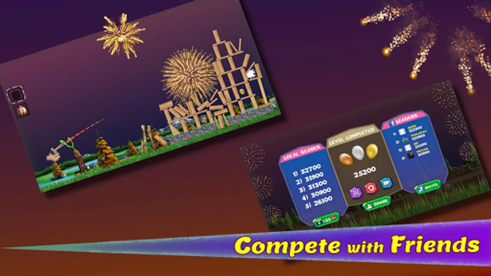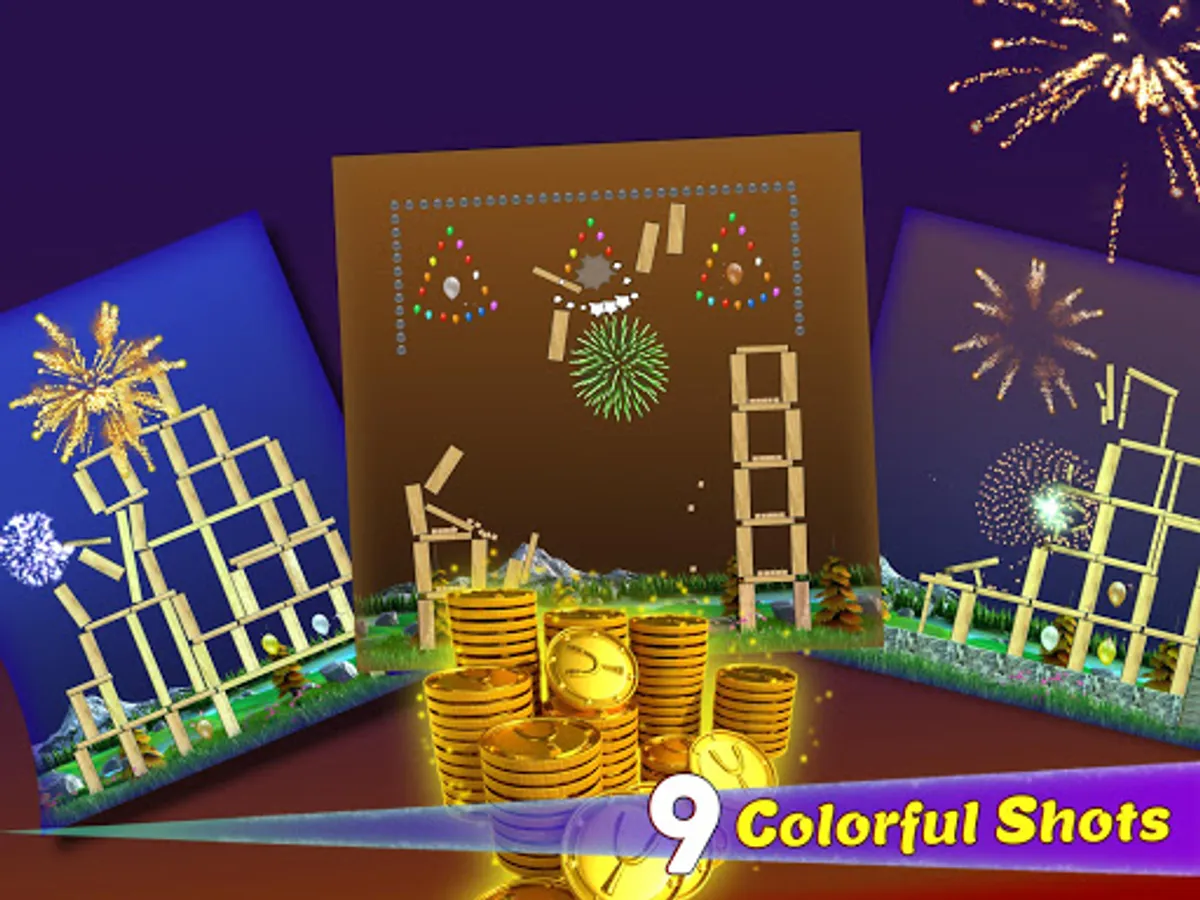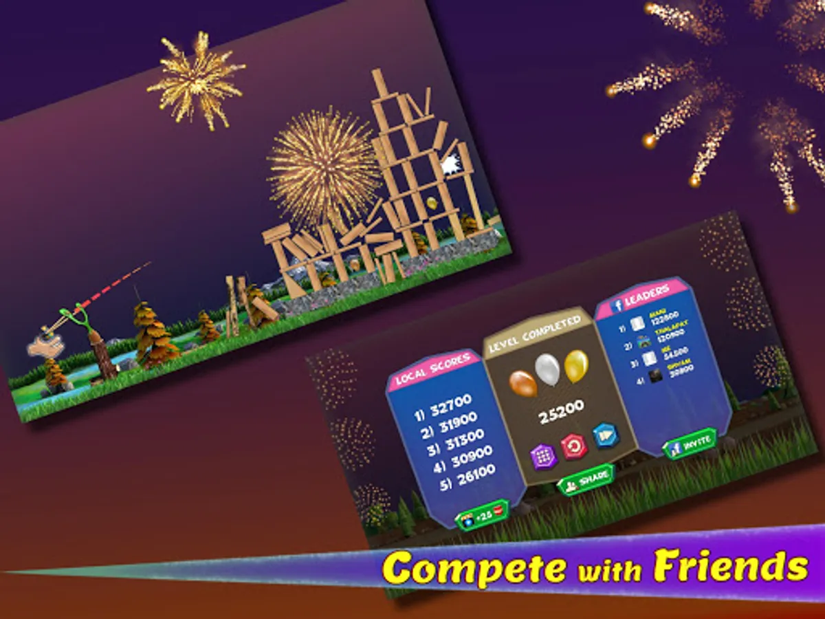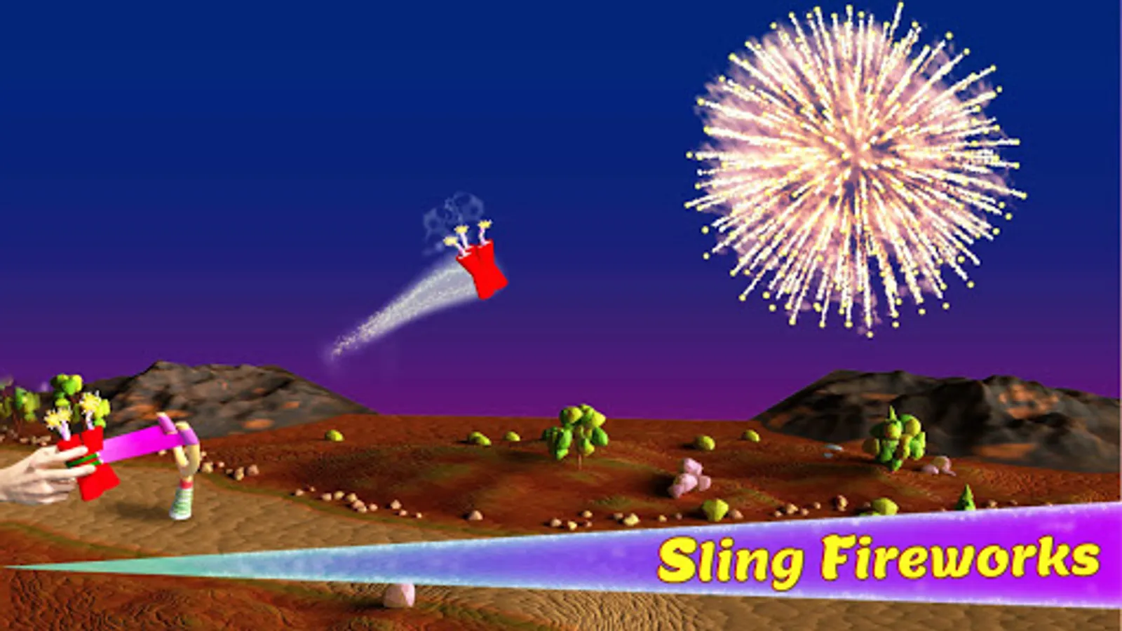Slingshot fireworks to pop target gold, silver and bronze balloons in exciting simulated fantasy environments.