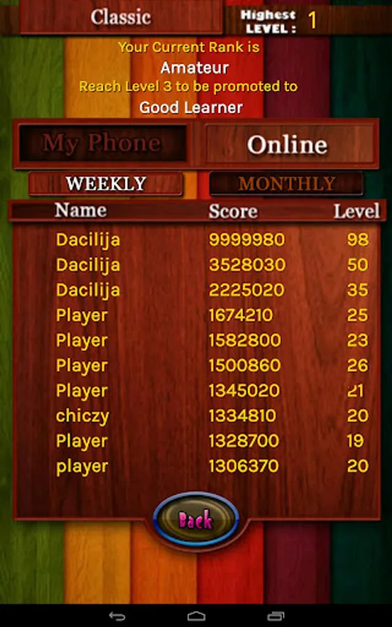 - All game modes have individual player ranking system based on the highest level/Score achieved.
