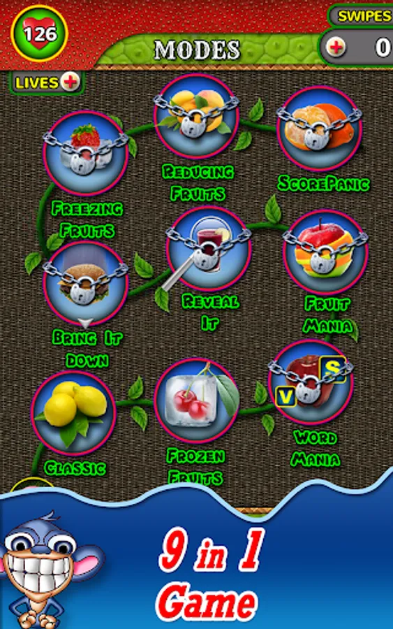 • Classic, Frozen Fruits, Word Mania, Fruit Mania, Reveal It, Bring It Down, Freezing Fruits, Reducing Fruits & Score Panic.