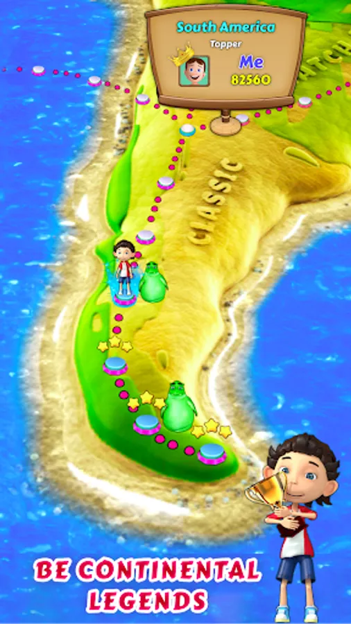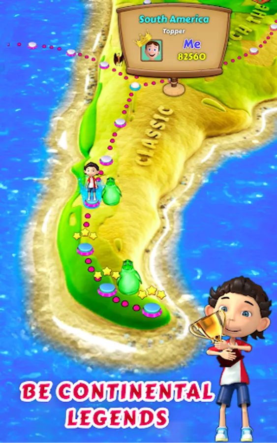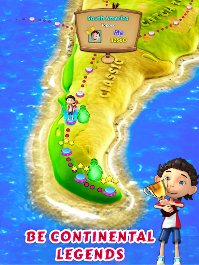 Game starts from southern tip of South America and you progress through paths by completing levels on them.