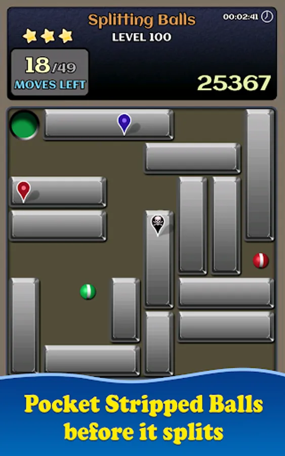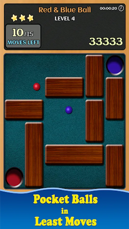 Pocket the colored balls in the same color holes in given moves, avoid dropping them anywhere else.