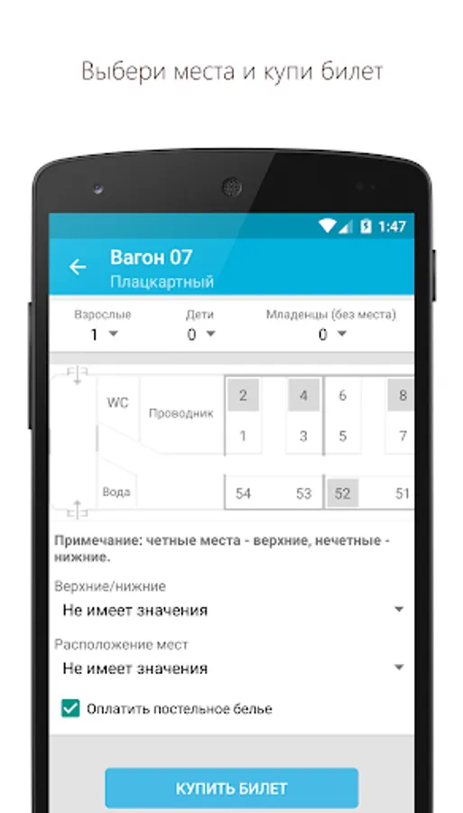 The app allows you to buy railway tickets without commission. This can be done in a few clicks, as an option to save the passenger data. The app allows you to view complete information on all purchased tickets: date of departure / arrival of the train, wagon number, place of ticket number. In addition, you can always pass your ticket by pressing just one button.