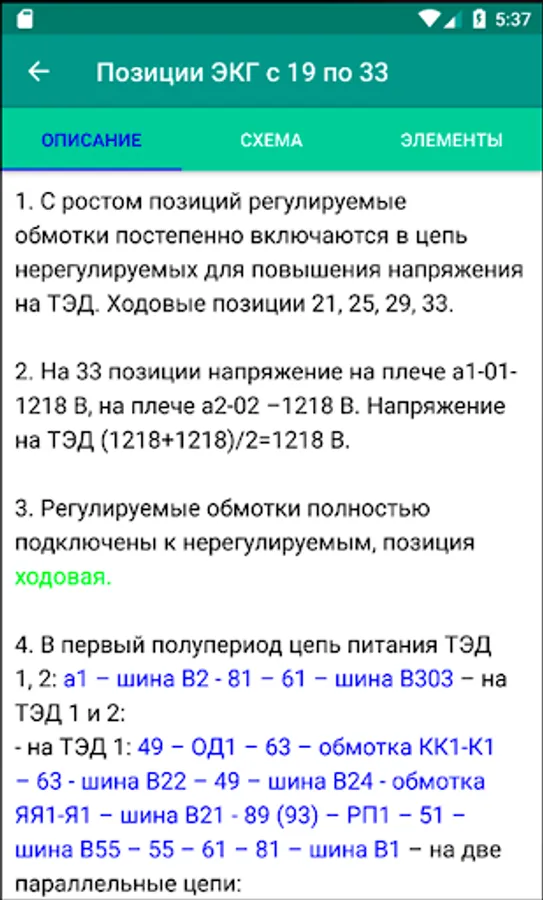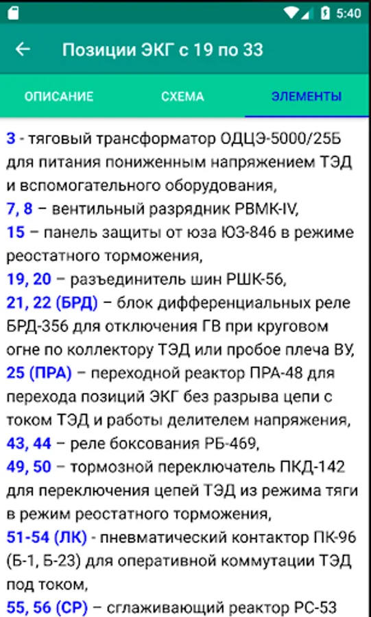 - a fragment of the electric circuit of an electric locomotive corresponding to a brief description of the circuit and its constituent elements,