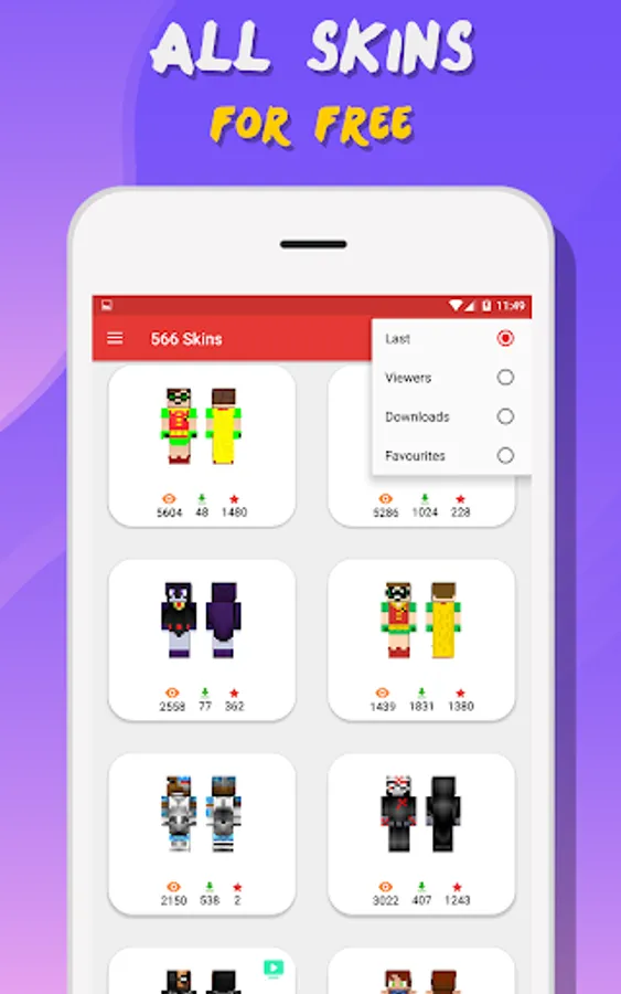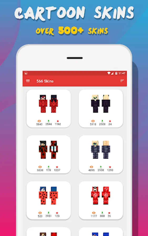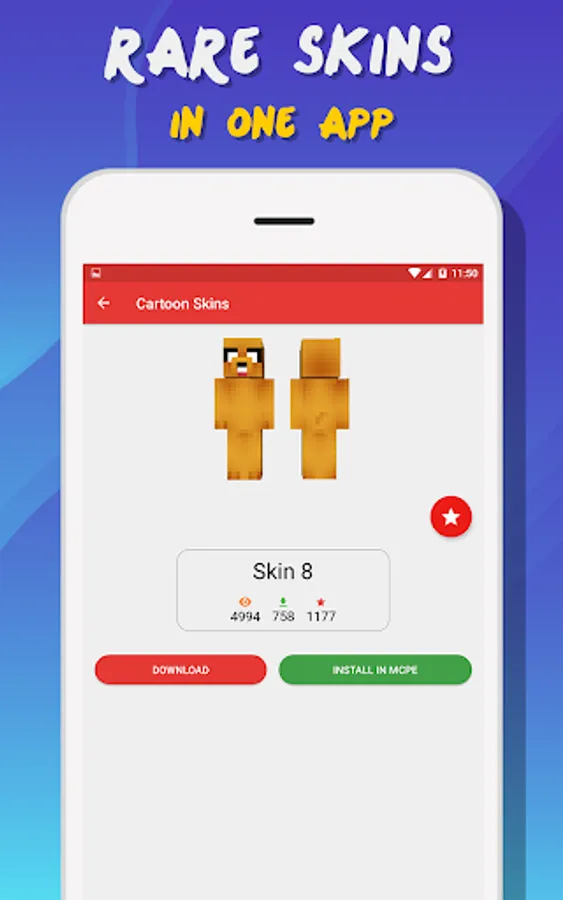 If you are tired of standard MCPE skins and are looking for trending skins - this app is what you need. Just select your favorite skin, click on the "Install in MCPE" button and in a second the skin will be installed in the game.