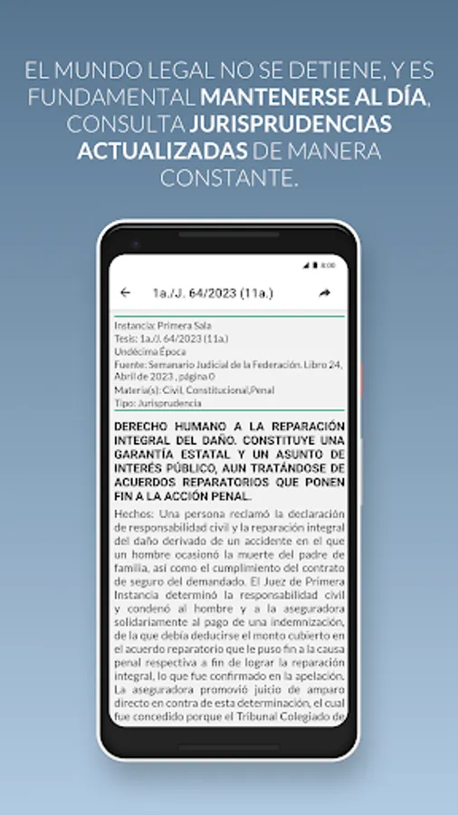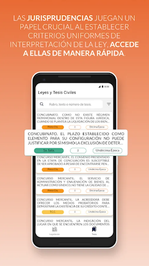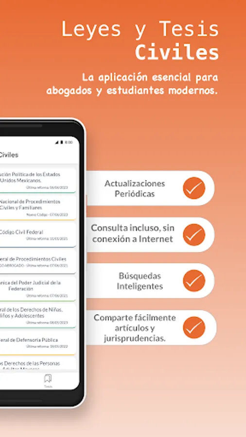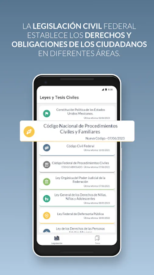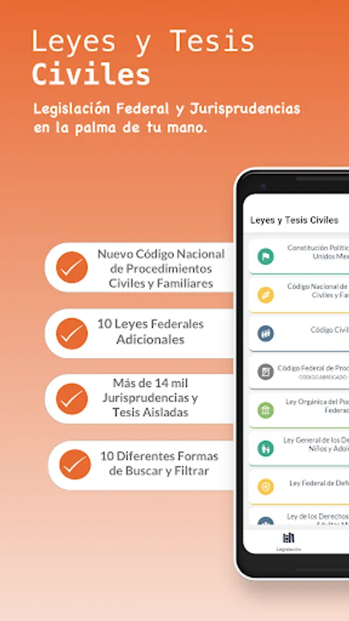 In an increasingly complex and dynamic world, it is essential to be aware of federal civil laws in Mexico. The regulations that govern our daily lives can have a significant impact on our decisions and actions, both personally and professionally. For this reason, we are pleased to present "Laws and Theses", the mobile application that offers you access to updated legislation and jurisprudence in civil matters, and that will help you navigate the legal universe with confidence.