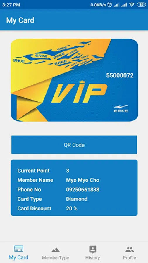 Member Application for ERKE Myanmar. In this application, ERKE Myanmar Member can pay without member card. And then ERKE Myanmar Member can see sales history, Member Card type, Discount percentage.