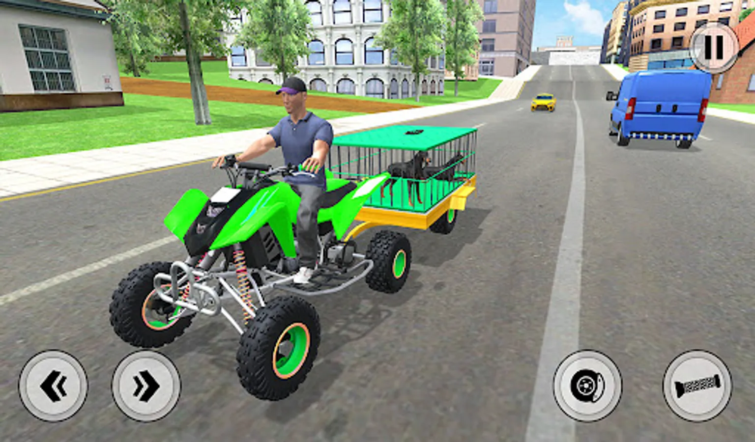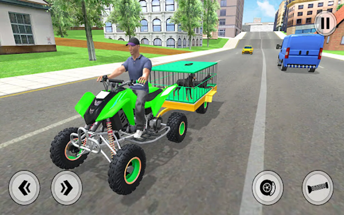 Sit behind the steering of a quad ATV bike and drive your cargo transporter ATV in the small city like never before. Avoid crashing into cars parked and moving across the real city. Play the role of a pet shop owner in this cargo ATV games, your job is to sell these cute pet dogs to their new homes. Drive an ATV trolley to play this cute pet dog cargo transport games and enjoy one of the best ATV games in 2022. Forget all farm animal transport or zoo animal transport game with Euro truck driving missions on offroad tracks and cities. Pick and drop Dachshund and Doberman to their new homes from the pet care center in this dog transport simulator game for free.