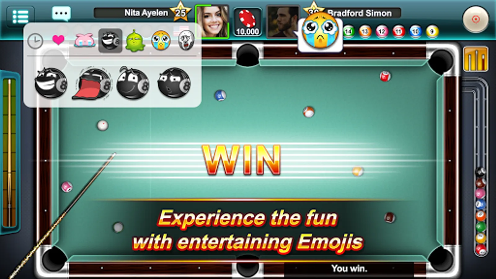 - Over 10,000 specially designed cues, tables and emoticons for you to a nicely set-up. Build your own pool club!