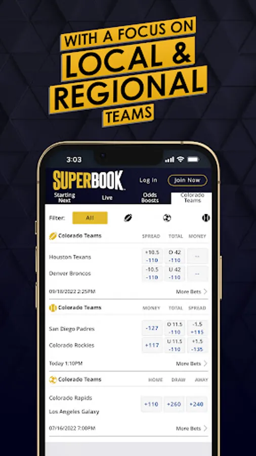 We bring all the biggest and best action right to the palm of your hand. The Colorado SuperBook Sports app is designed to offer the best odds, as well as the first to market prices and higher wagering limits. We offer compelling odds boosts and regionally relevant offerings not often found outside the Las Vegas market. Our prop menu is extensive and well beyond most of the other apps found in an app store. Not sure where to start? The opening page will take you to “Starting Next” so that you don’t miss out on any of the upcoming action.