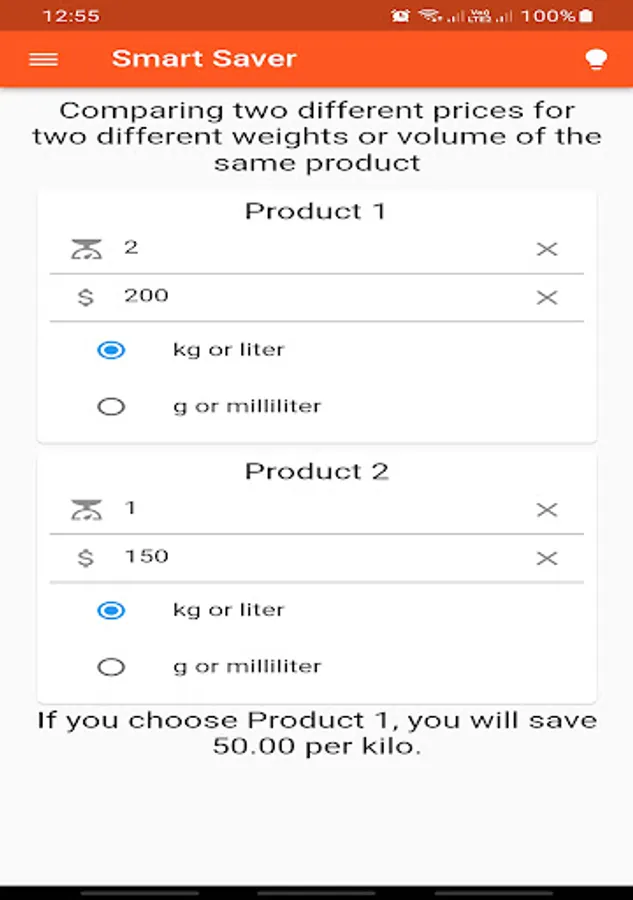 Thanks to "SmartSaver," making decisions is no longer difficult. The app analyzes offers and prices, identifying the cheapest options effortlessly. Simply input the price and weight of the first pack and the second one, and the app will save your money by calculating the difference between them. You'll know which one saves you more money and assists you in smart shopping with confidence.
