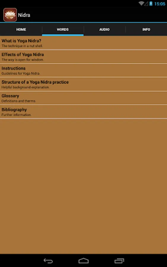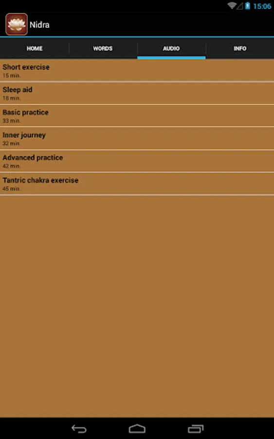 The yoga nidra relax app contains 6 guided audio exercises of different length and intensity, which guide you systematically and professionally into a state of deep relaxation. The exercises can be done at home, but also while sitting in the train, plane or office. No special knowledge or means are required for the practice.