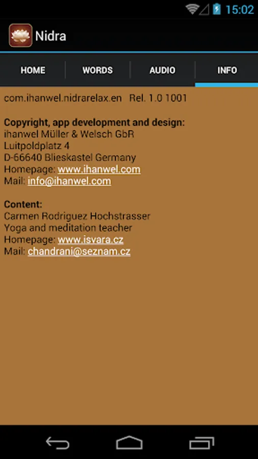 Through the regular practice of yoga nidra the stress hormones are reduced, the regenerative body functions and the immune system are stimulated. It has been tested by physicians and scientist all over the world, who accredited it as an efficient support in the treatment of psychosomatic diseases. Mainly in afflictions such as sleep disturbances, nervousness, heart and stomach diseases, asthma and migraine Nidra-relax app has been recommended by the german magazine GEO Special Yoga: