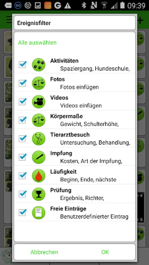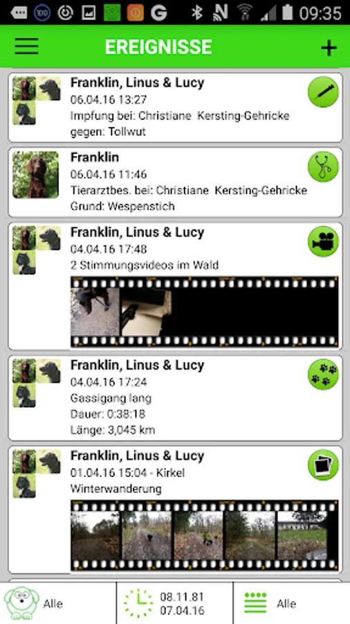 On the home page you get an overview of all the events, such as Body measurements, activities, visits to the vet, photos and more. Would you like it even easier, you can also set filters.
