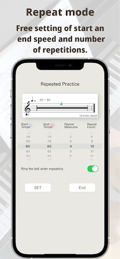 the number of measures to practice with, and Smart Metronome incrementally increases the tempo