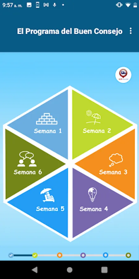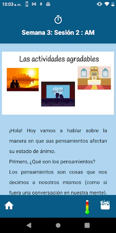 El contenido de la app se divide en 6 semanas, con un tema diferente para cada semana, tal como “Actividades placenteras” y “Relajación”. La psico-educación se realiza en presentaciones breves (de 1-3 minutos) de video y de grabaciones de audio.
