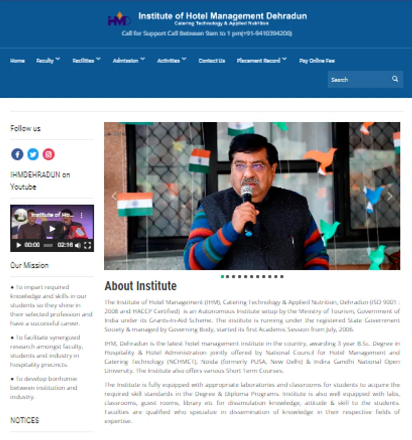 The Institute of Hotel Management (IHM), Catering Technology & Applied Nutrition, Dehradun (ISO 9001 : 2008 and HACCP Certified) is an Autonomous Institute setup by the Ministry of Tourism, Government of India under its Grants-In-Aid Scheme. The institute is running under the registered State Government Society & managed by Governing Body, started its first Academic Session from July, 2006.