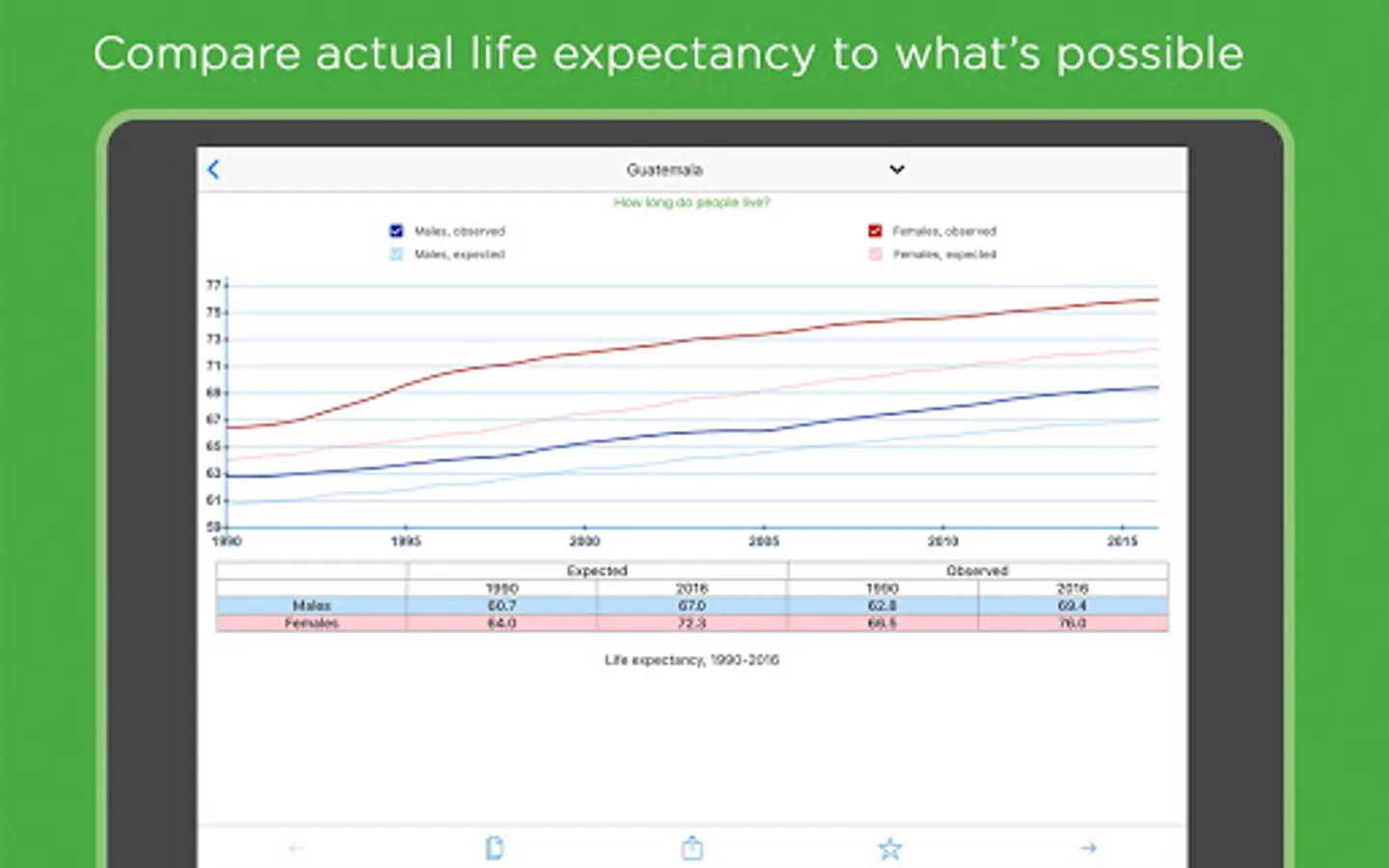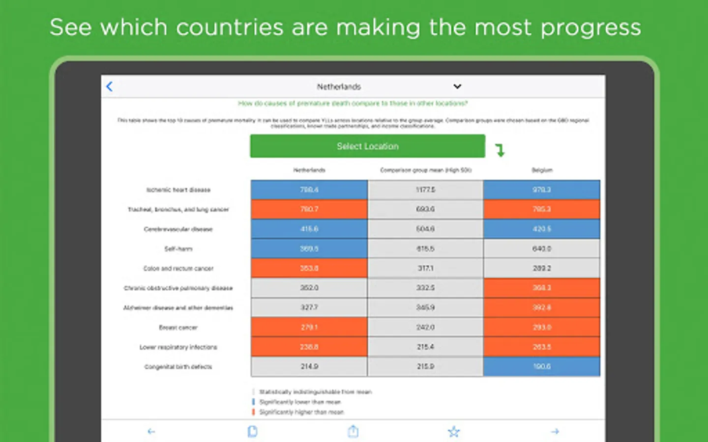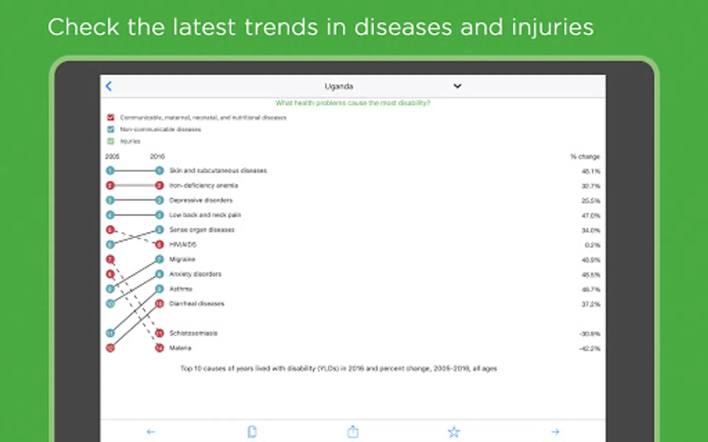 The Health Atlas by IHME app provides country-level findings from the Global Burden of Disease (GBD) for non-commercial use. They are based on more than 115,000 different data sources used by researchers to produce the most scientifically rigorous estimates possible. Estimates from the GBD study may differ from national statistics due to differences in data sources and methodology. For the first time, you can now access this wealth of data from anywhere on your mobile device.