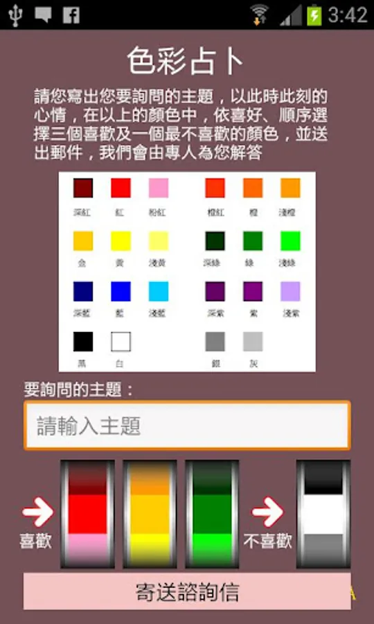 色彩占卜App是由國際知名色彩心理解析專家也是位臨床醫師-呂姵瑤醫師所免費提供,色彩占卜App提供您在工作上、感情上、現況上等重要資訊與方向,您可以選擇一個顏色後可立即自行占卜或分析,您也可以選擇多色後,利用此App將選色結果email給專家,專家將會免費為您解析,這個App的準確性及方便性絕對值得您隨身使用,對於您的人際關係、事業、感情、愛情、課業等絕對有很大幫助。