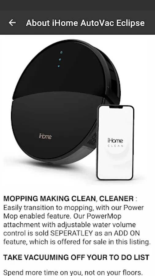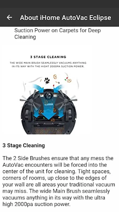 The 2 Side Brushes ensure that any mess the Autovac encounters will be forced into the center of the unit for cleaning. This app, in which the features iHome AutoVac Eclipse are explained, is a guide.