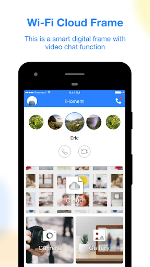 ihoment smart frame also has two-way video chat function, which can make video or voice call between two ihoment frames and also between ihoment frame and ihoment app. You can make a video call from your contacts of the ihoment frame and talk to whoever you want face to face.