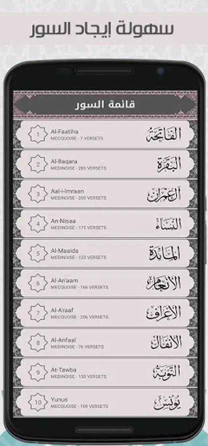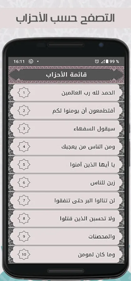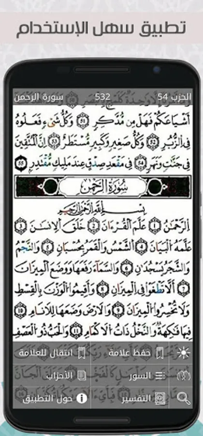 If you want to control the program, click on the screen, and in the upper bar you will see the name of the current Surah of the Qur’an, the page number, as well as the name of the party, while at the bottom a list will appear with a button to access the surahs list, starting with Surat Al-Fatiha and ending with Surat Al-Nas, and you can also access the list of the Qur’an parties, There is also a button to mark the page for the application to remember when you then press the Move button to the marker, and you can also change the brightness of the screen by pressing the allowed button, and you can also share the appraised Qur’an application with your friends via the share button and always remember that the signifier of good is as its doer.