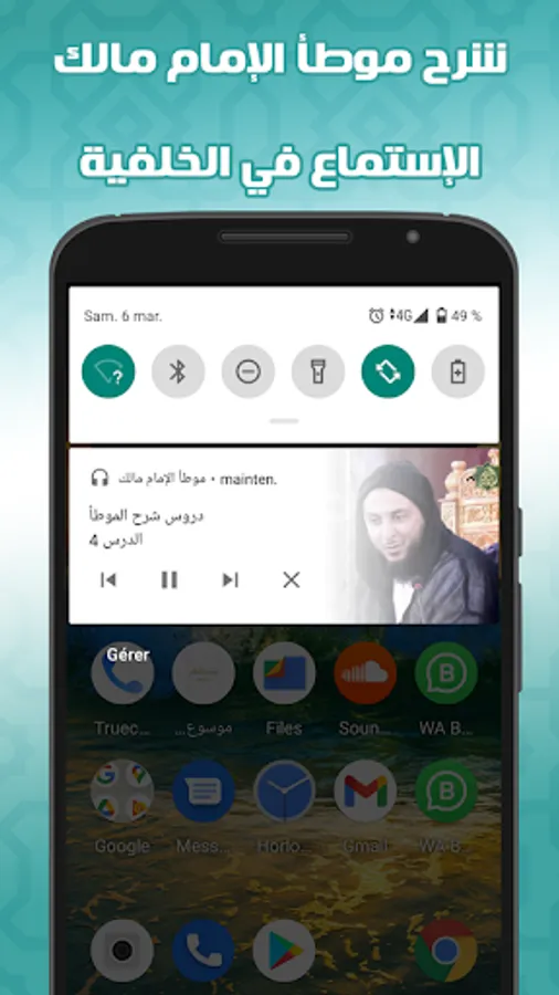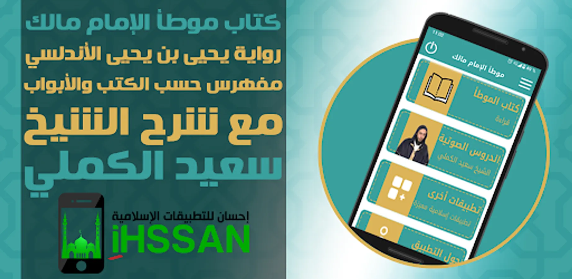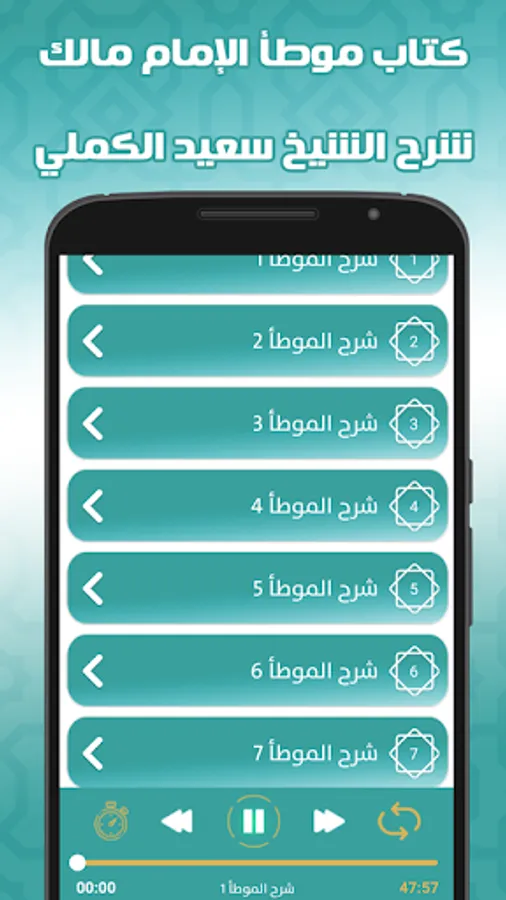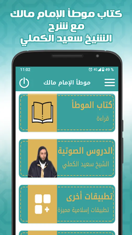The application features the book Al-Muwatta by Imam Malik with the explanation of Sheikh Saeed Al-Kamali: