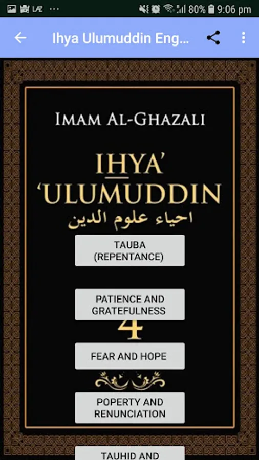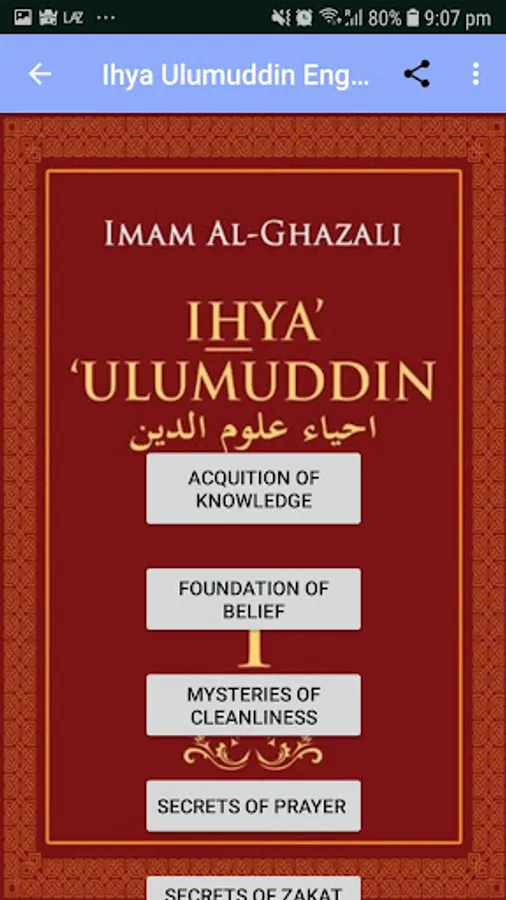 The Revival of the Religious Sciences is divided into four parts, each containing ten chapters. Part one deals with knowledge and the requirements of faith—ritual purity, prayer, charity, fasting, pilgrimage, recitation of the Qurʾān, and so forth; part two concentrates on people and society—the manners related to eating, marriage, earning a living, and friendship; parts three and four are dedicated to the inner life of the soul and discuss first the vices that people must overcome in themselves and then the virtues that they must strive to achieve. Below are details of the contents of the Ihya Ulumuddin English Version