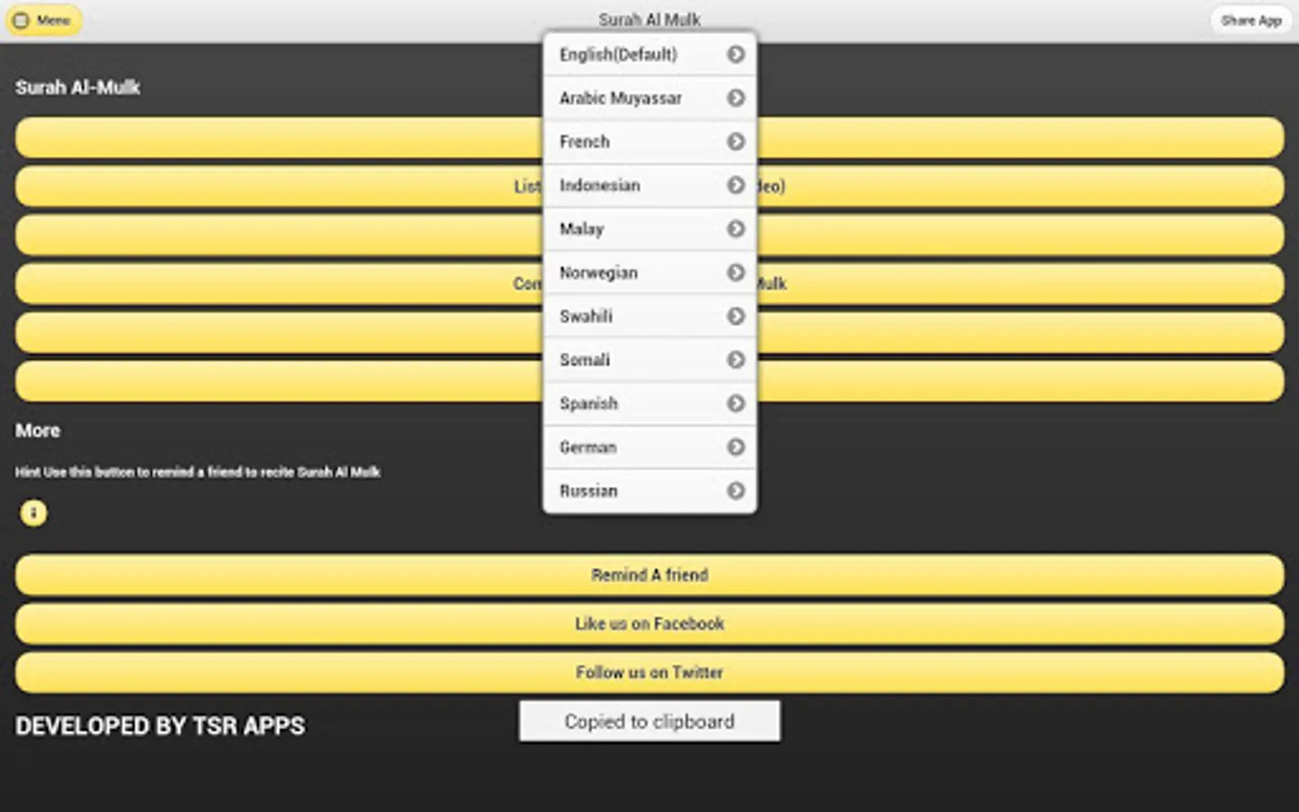 - View translations of Surah Al Mulk and Al-Sajdah in 15 different languages (English,Arabic Muyassar,French,Indonesian,Swahili,Malay,Norwegian,Somali,Spanish,German Russian and Tamil ,Hausa,Urdu and Hindu more coming soon.)