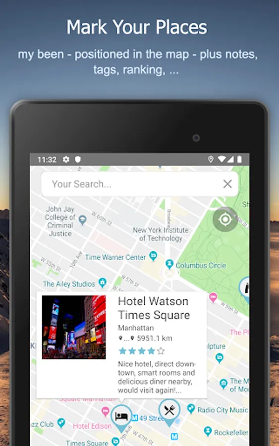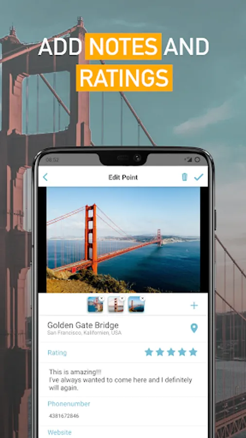 Structure, rank and find your places again individually by name, ranking, notes, categories, tags,...