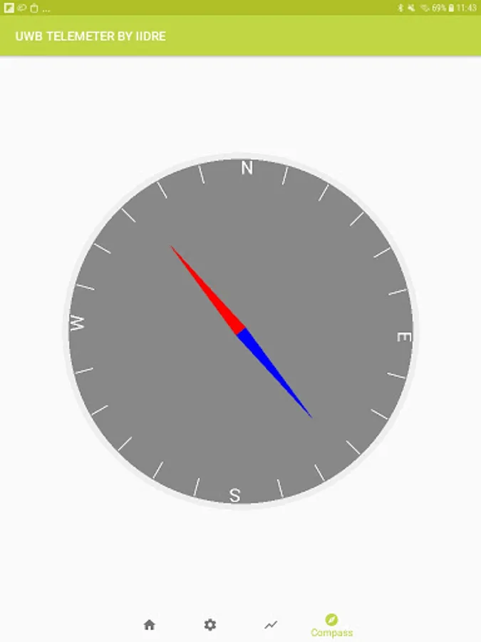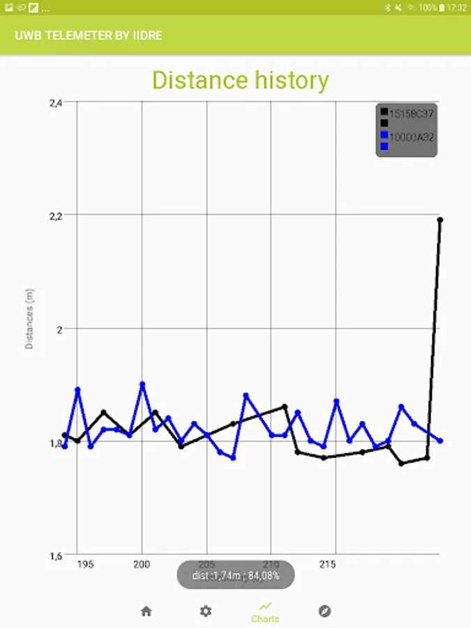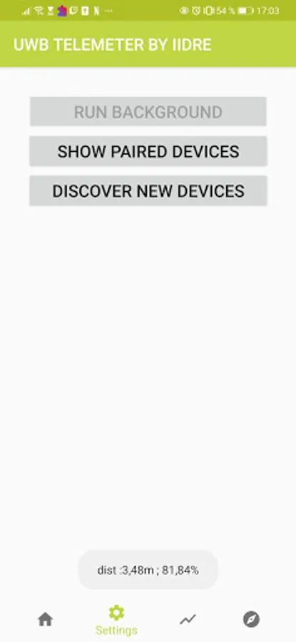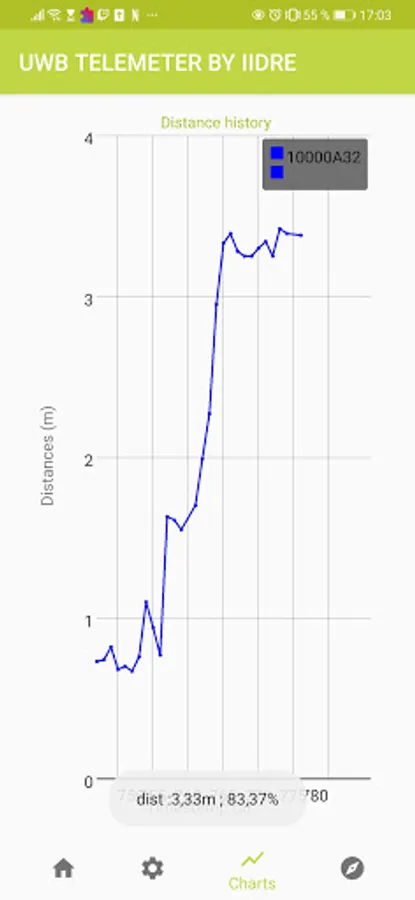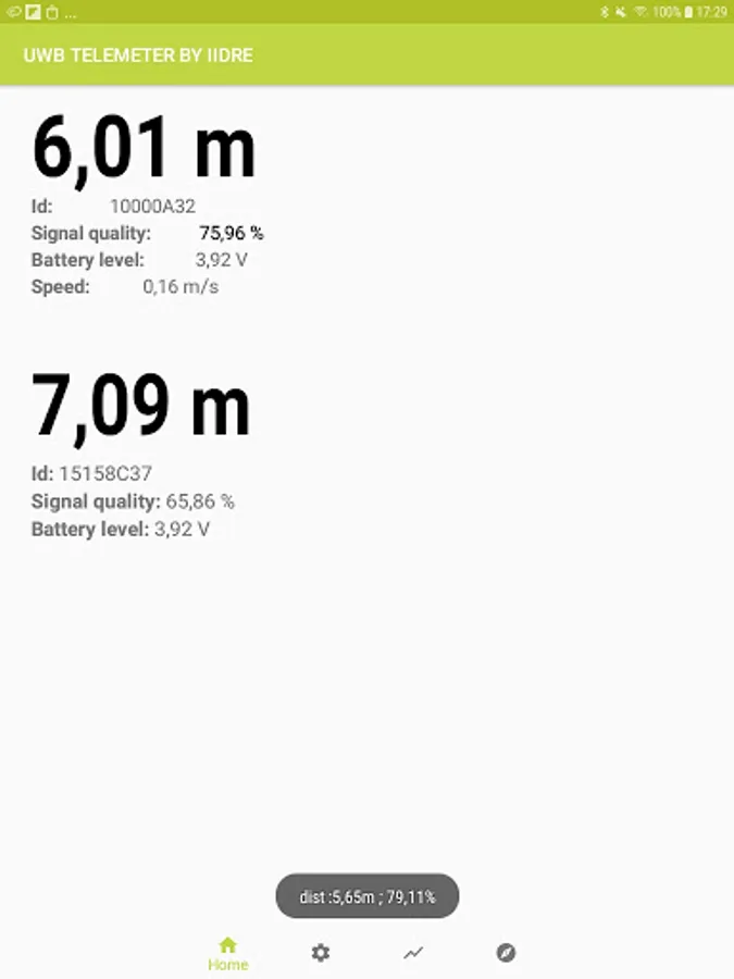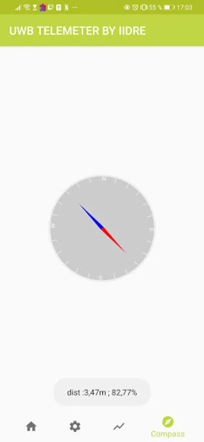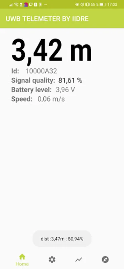 UWB Telemeter allows you to view the distances measured in Ultra-wideband (UWB), with additional indicators: the identifier of the device concerned, the battery level of the devices and the quality of the signal. The application allows you to measure the distances between several devices, to have a history of the distances measured, but also to know the orientation with respect to the North of the different devices.