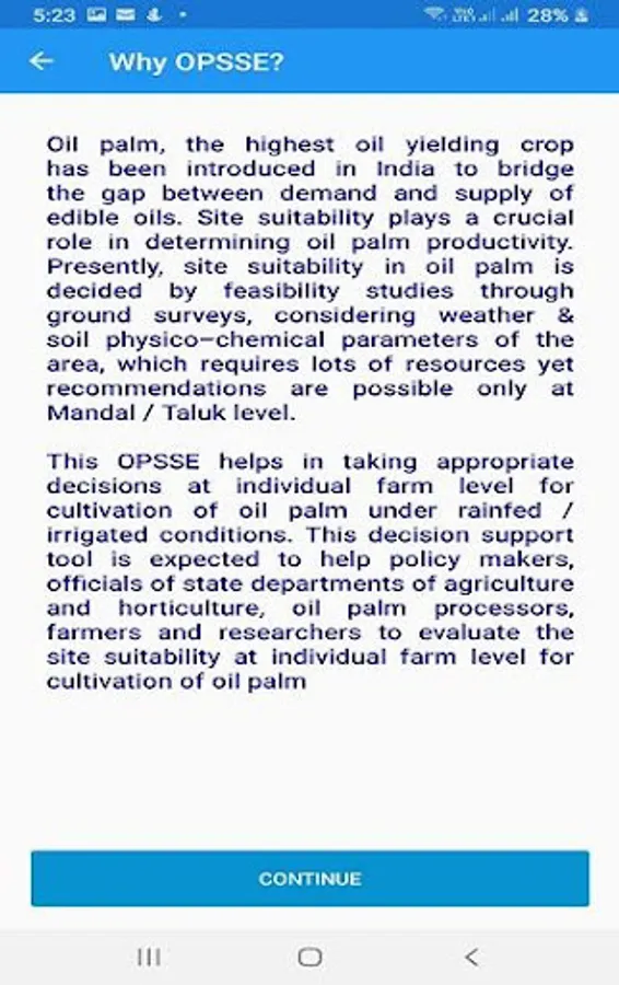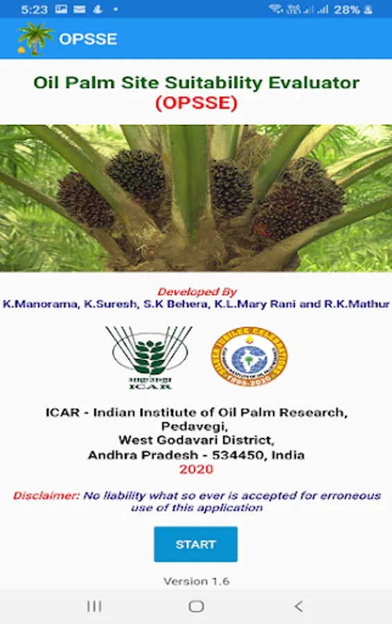 Oil palm, the highest oil yielding crop has been introduced in India to bridge the gap between demand and supply of edible oils. Site suitability plays a crucial role in determining oil palm productivity. Presently, site suitability in oil palm is decided by feasibility studies through soil physico-chemical parameters of the area, which requires lots of resources yet recommendations are possible only at Mandal/Taluk level. This OPSSE helps in taking appropriate decisions at individual farm level for cultivation of oil palm under rainfed / irrigated conditions to help policy makers, officials of state departments of agriculture and horticulture, oil palm processors, farmers and researchers to evaluate the site suitability at individual farm level for cultivation of oil palm.