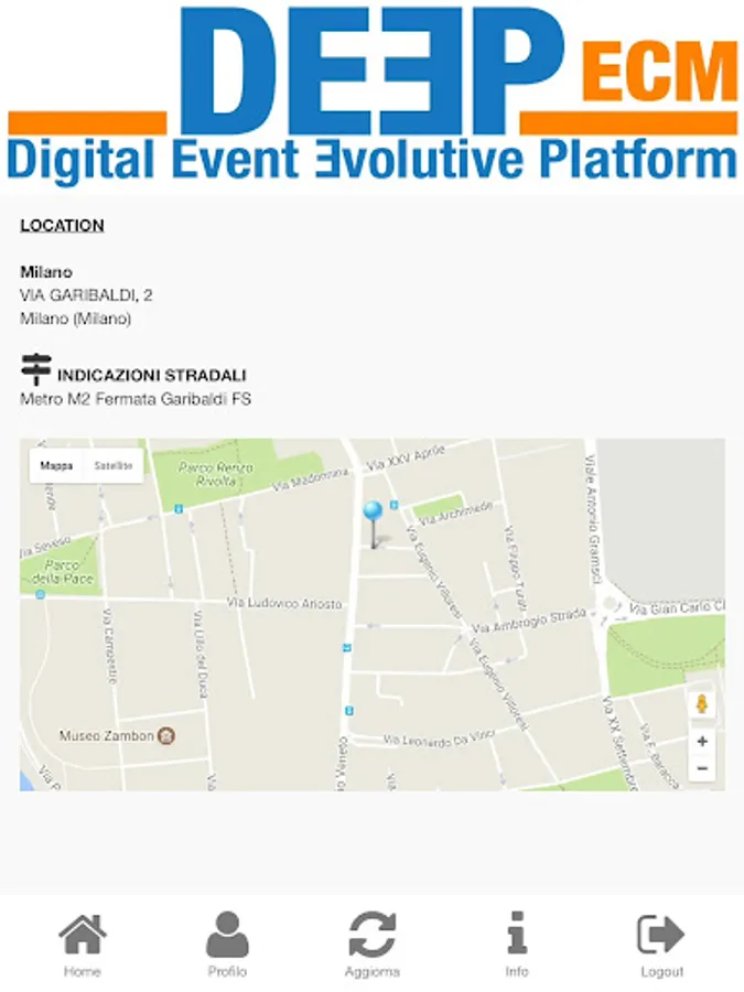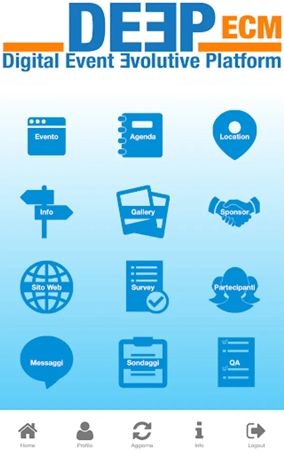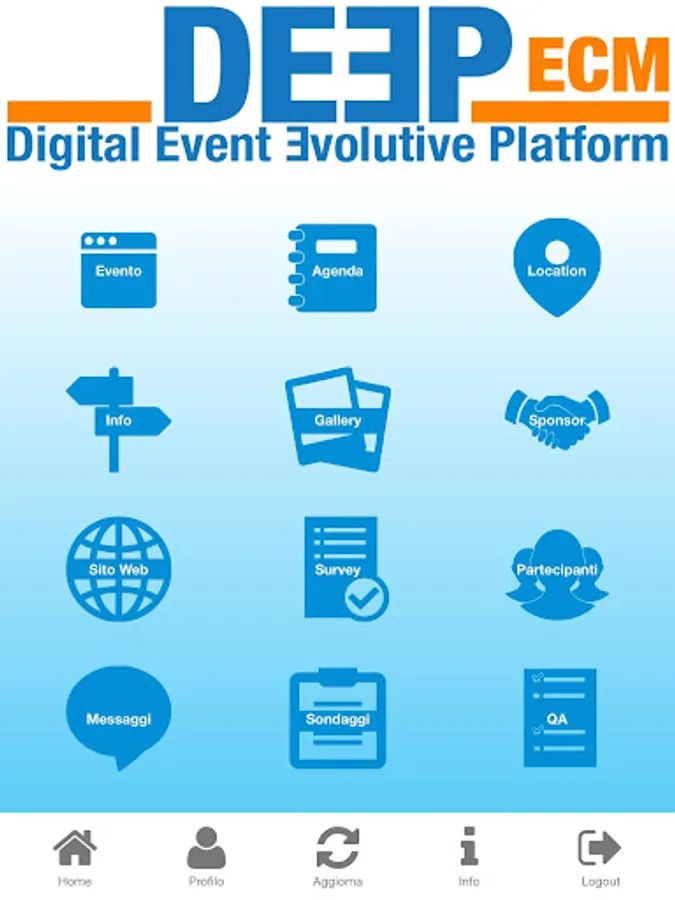 Deep: for apps platform for medical events: congresses, conferences, ECM training, meetings. It supports all phases of the event: from registration to issue Agenas tracked.