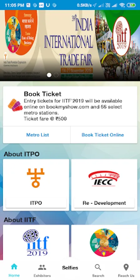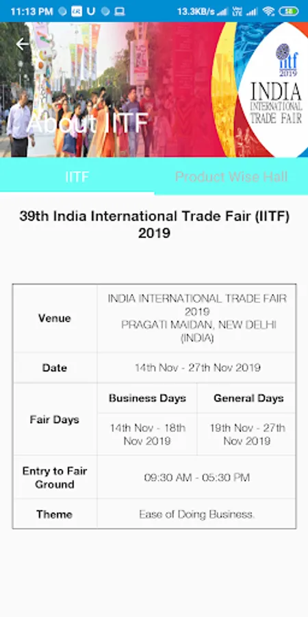 November 14-27, 2019 at Pragati Maidan, New Delhi. IITF with B2B and B2C components is one of the largest integrated trade fairs. IITF 2019 application helps users to easily navigate to ITPO, Pragati Maidan relevant Gates, as well as to relevant Halls in the exhibition. It also helps user to easily search for exhibitors based on their names, hall numbers, stall number and product on display. This application provides complete and consolidated information about the fair.