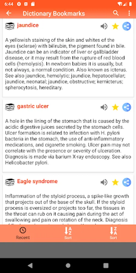 The medical dictionary bookmark feature provides users different sorting features along with dictionary search feature.