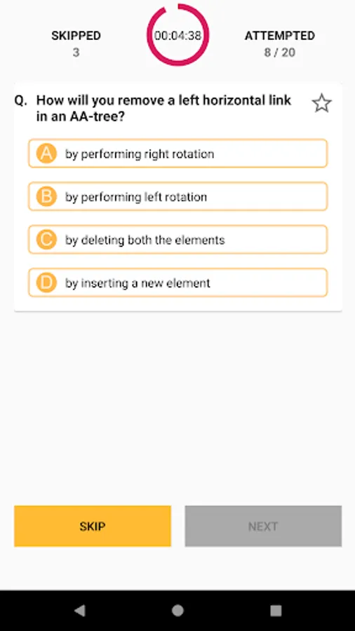 The favorite mcqs feature allows a user to make favorite or bookmark a data structures mcq of his/her choice, so that it can be easily pin pointed and practiced whenever required.