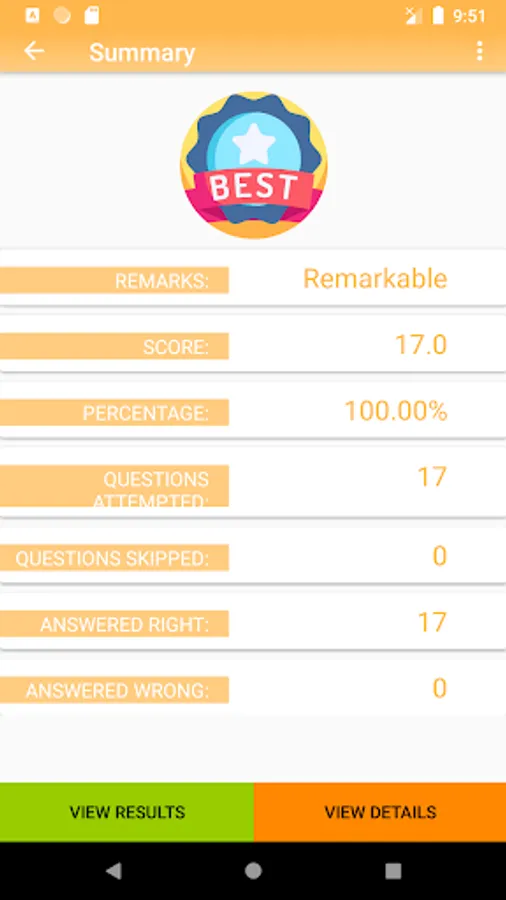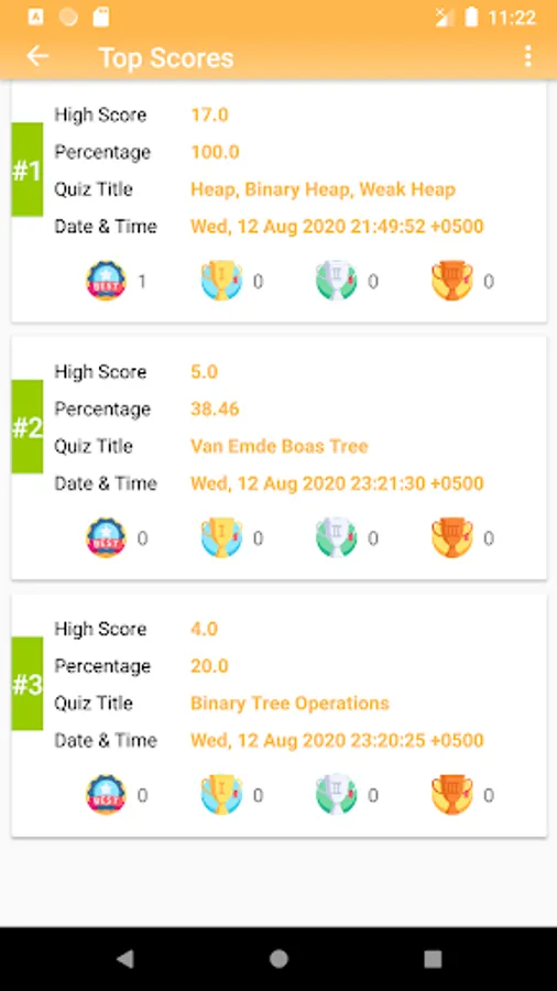 After attempting a MCQ Quiz, user can view the summary report with appropriate reward, detailed reports, top scores with number of different award wins. User can also clean-up the quiz reports, if needed.