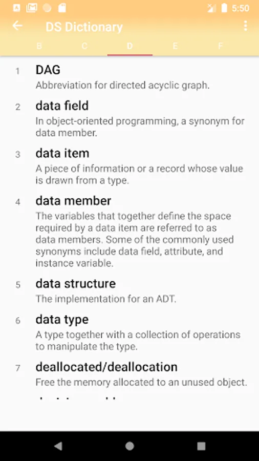 The app also provides a complete and full Data Structures and Algorithms Dictionary describing each and every term of the Data Structures and Algorithms in a short and precised way.