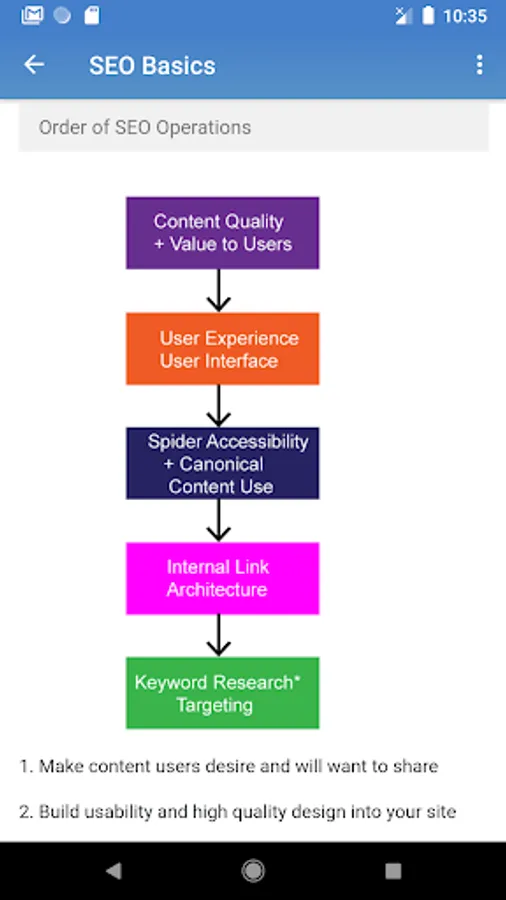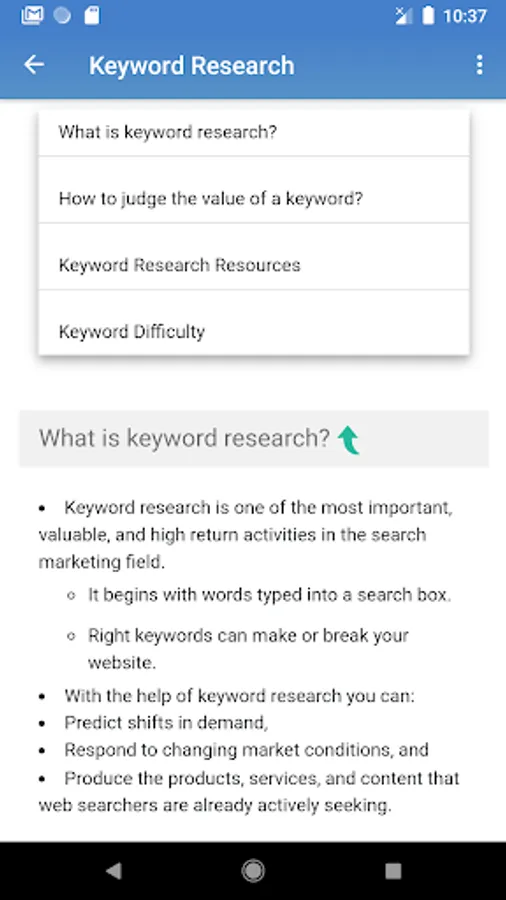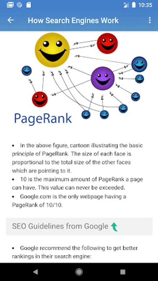This seo app helps the students to learn the basics of Search Engine Optimization (SEO) in a very easy and step by step manner for FREE & OFFLINE. This SEO course is designed for beginners as well as advanced users who want to increase their expertise in the field of SEO by learning the essential SEO techniques to boost their websites or apps for maximum audience reach.