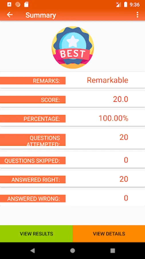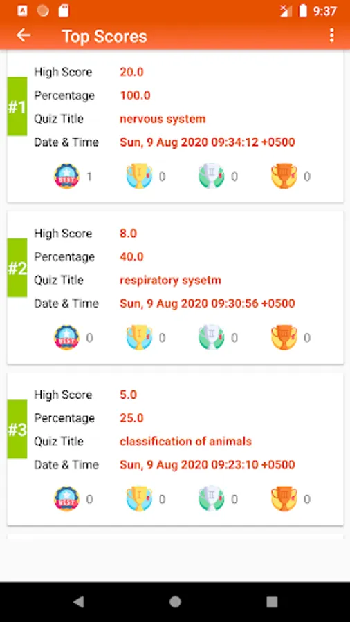 After attempting a MCQ Quiz, user can view the summary report with appropriate reward, detailed reports, top scores with number of different award wins. User can also clean-up the quiz reports, if needed.