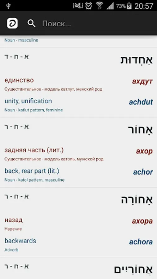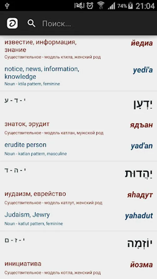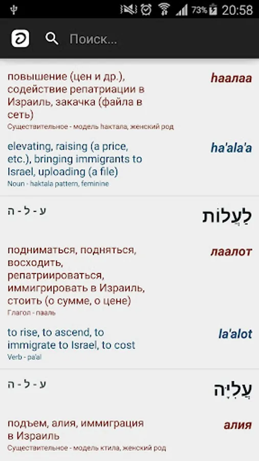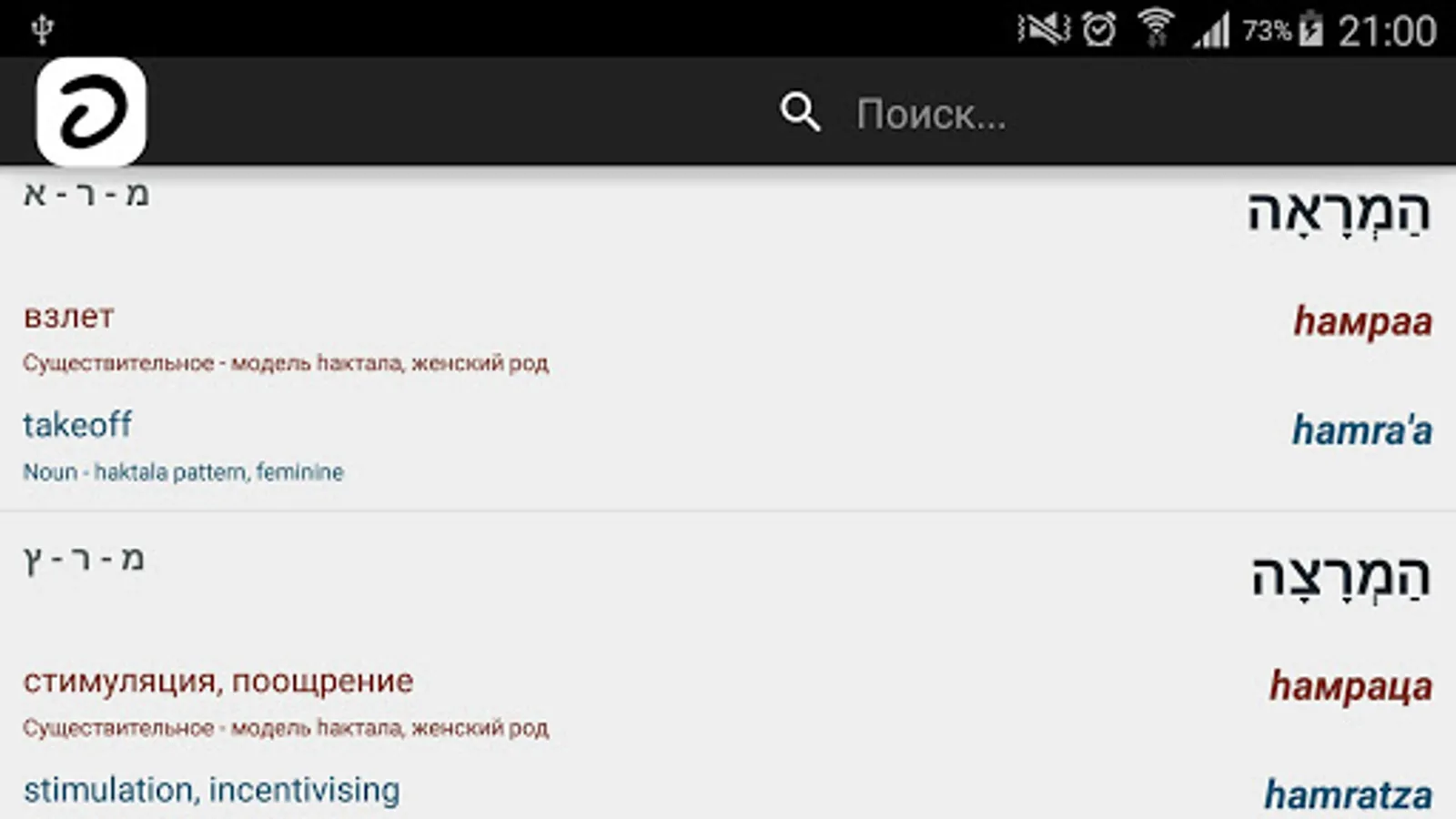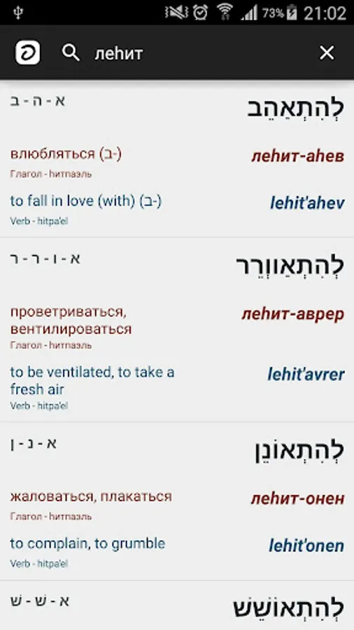 Hebrew-Russian-English offline dictionary with vowels and transcription.