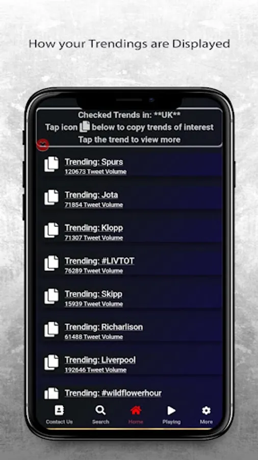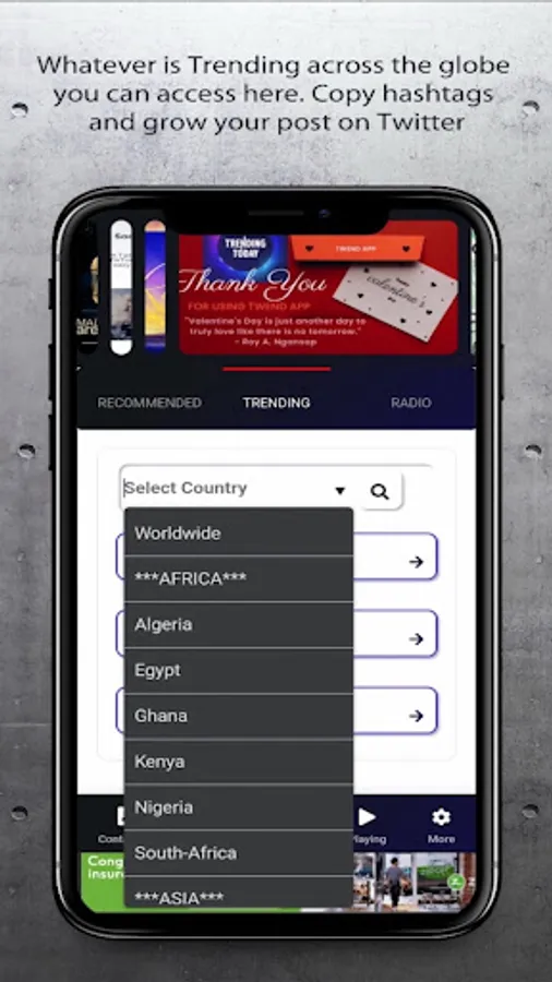 Our Trends tab provides you access to what’s Trending/Hashtags across the Globe on Twitter. To Increase your followers/make your business and product visible in any country, select, copy and paste along your post to make it visible .Our Apps are always updating the list of hashtags displayed to include new or trending hashtags.