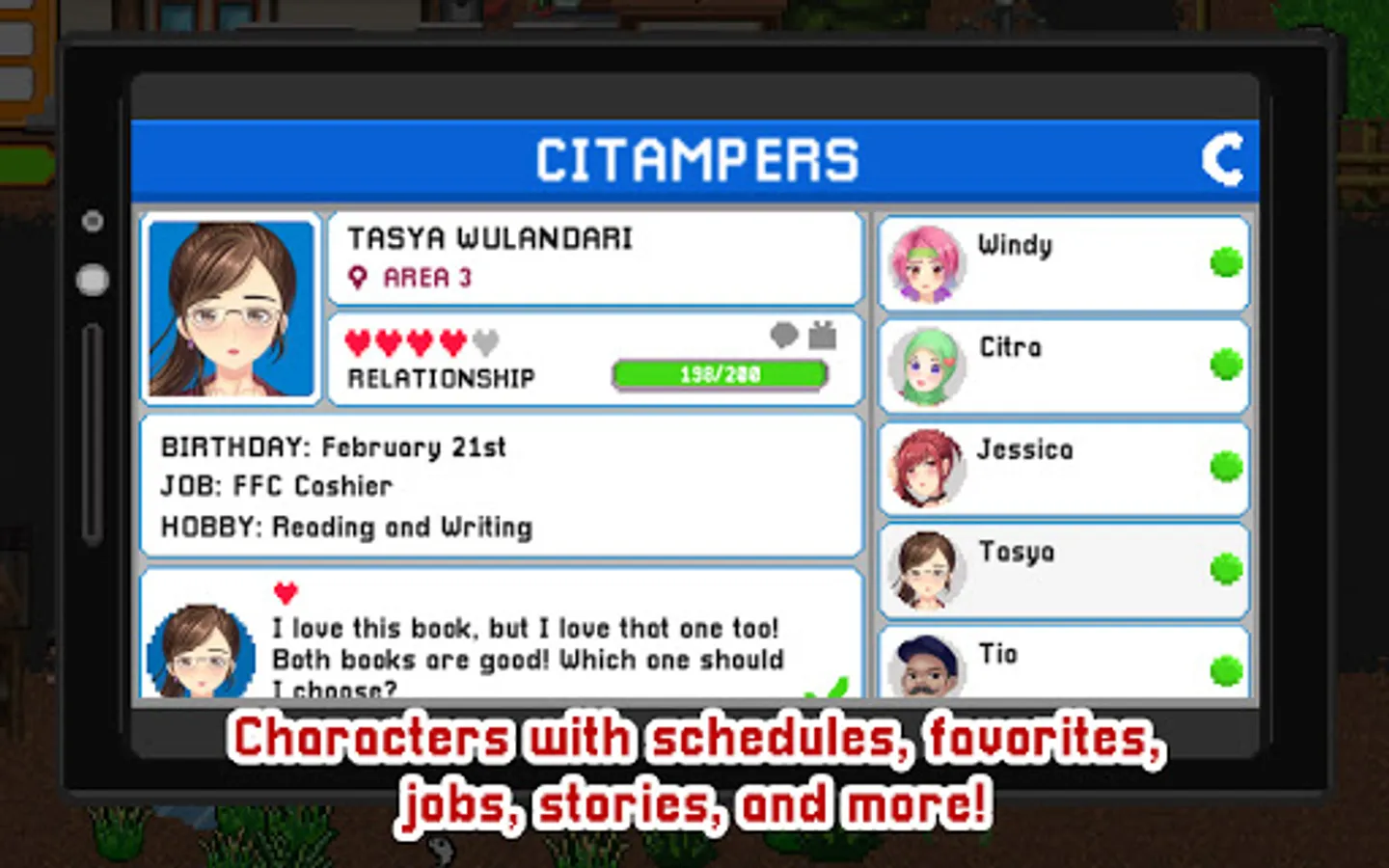 You decided to move to the town of Citampi to pay your parent’s debt and find your happiness. However, you also found so much more there! You also found a lot of beautiful girls in this pixel art – anime game. You'll feel like you're trapped in a dating sim (not that it's a bad thing though).