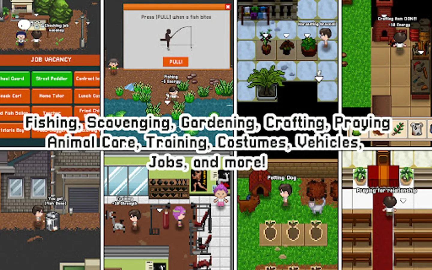 This is more than just a visual novel or farming life in another world. In this open-world RPG game you can also find various quirky jobs, Grow and harvest fruit and vegetable inside farming simulator minigame, find items to scavenge and craft it into something else, adopt an animal as your pet, treasures to found, fishes to catch, cook food for your family in this expanded virtual life games.
