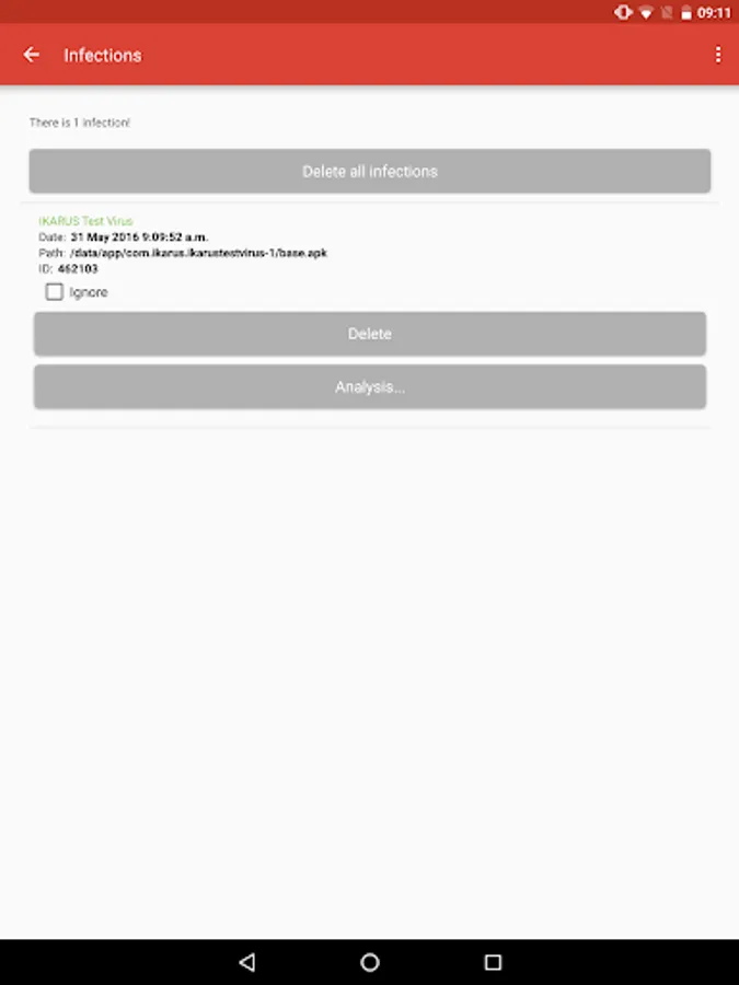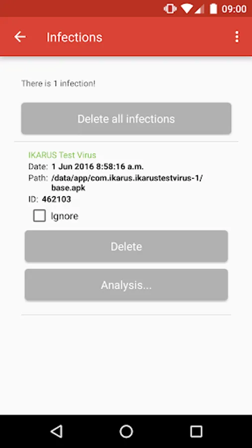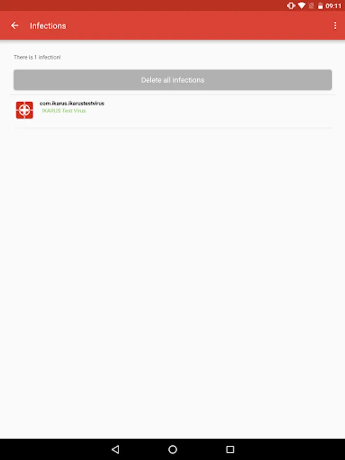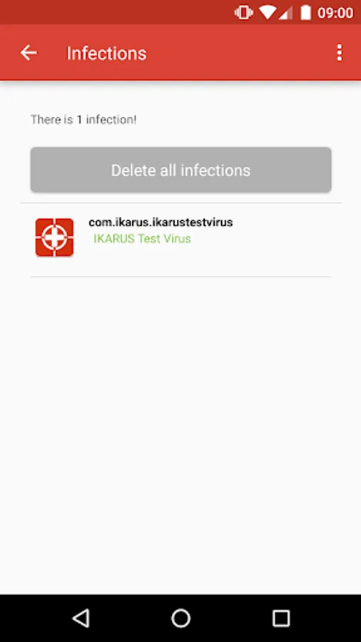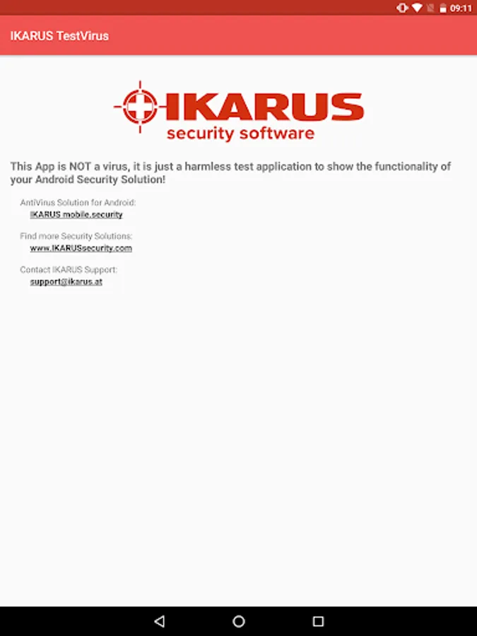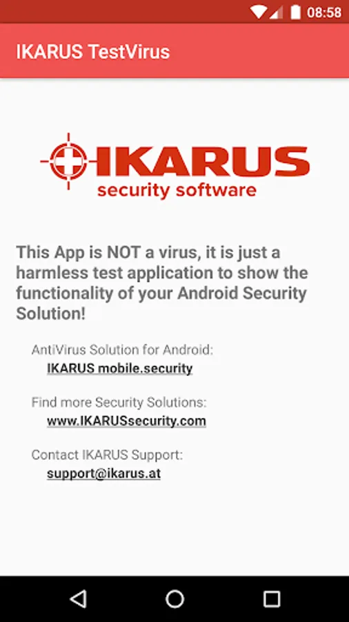 The security app IKARUS mobile.security shows the note “IKARUS TestVirus” when detecting the file. Other anti-virus solutions may show different names for the app or just classify it as common malware.