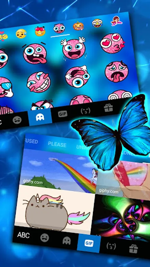 * Enjoy Delicate Neon Butterfly Keyboard Theme with cute emoji and delicate fonts.