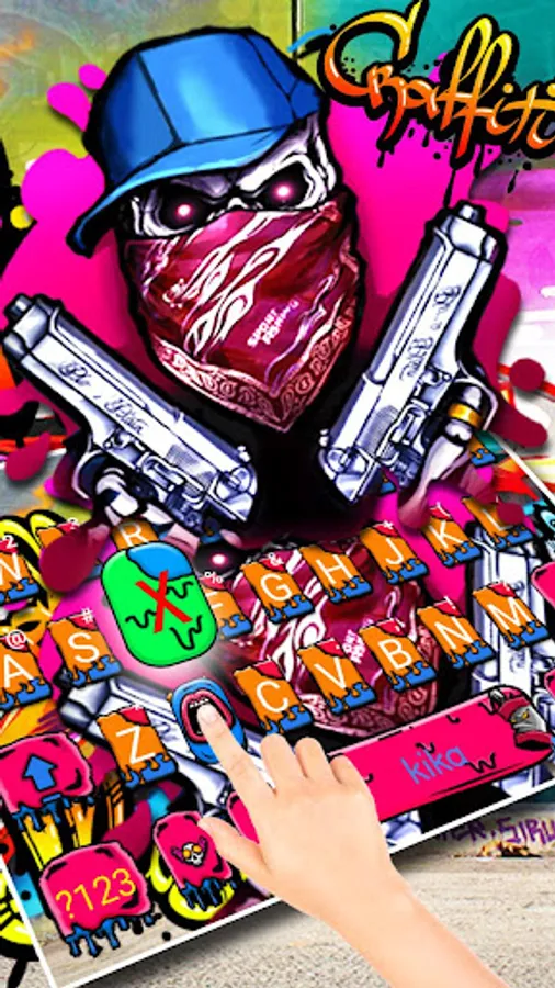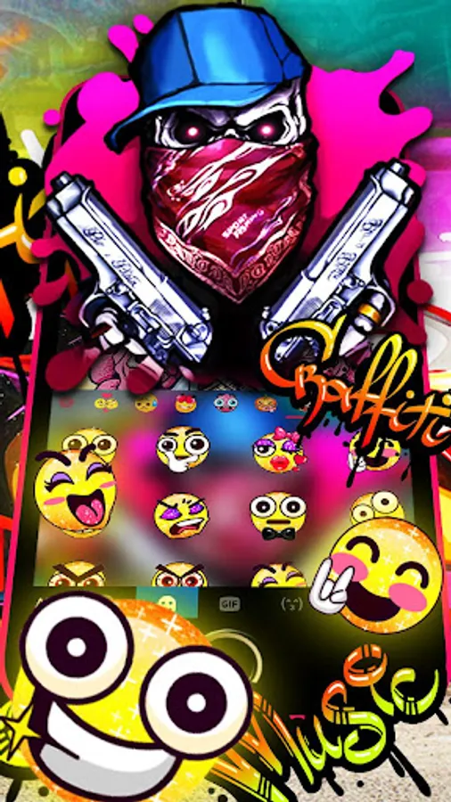 * Enjoy Graffiti Gun Mask Skull Keyboard Theme with cute emoji and delicate fonts.