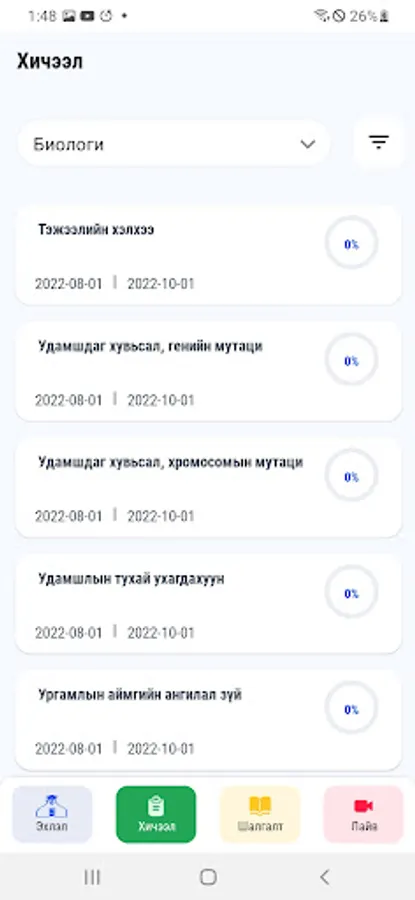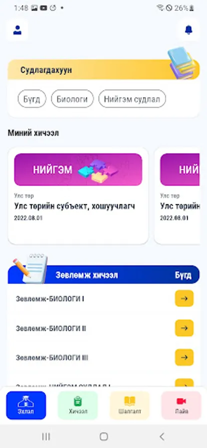 Нэг сэдвийн хүрээнд онолын хичээлүүдээ үзээд өөрийгөө сорих шалгалтын материалуудтай
