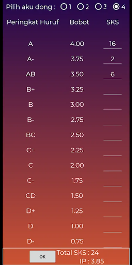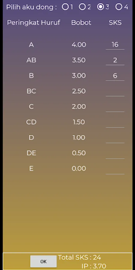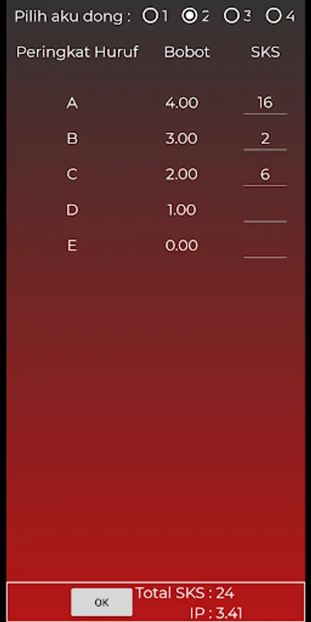 simply enter the number of credits in accordance with the weight you get it will automatically calculate your IPK, there are also 4 choices of modes that you can use, adjust to the policies of each campus.
