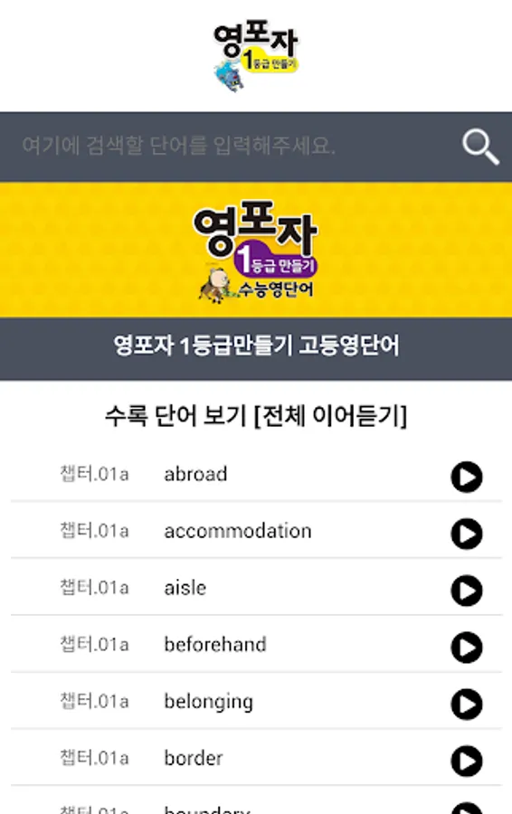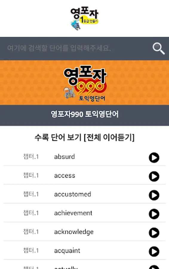 영단어 실시간 플레이로 발음과 뜻을 이해하는데 도움을 많이 주는 앱입니다.